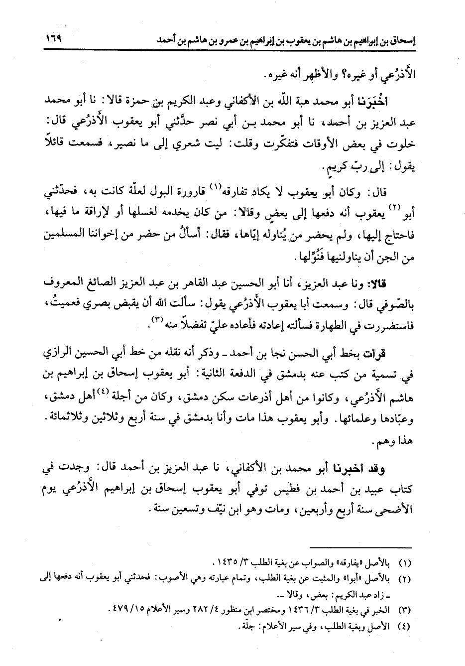 الأذرعي أو غيره والأظهر أنه غيره أخبرنا أبو محمد هبة الله بن الأكفاني وعبد الكريم بن حمزة قالا نا أبو محمد عبد العزيز بن أحمد نا أبو محمد بن أبي نصر حدثني أبو يعقوب الأذرعي قال خلوت في بعض الأوقات فتفكرت وقلت ليت شعري إلى ما نصير فسمعت قائلا يقول إلى رب كريم قال وكان أبو يعقوب لا يكاد تفارقه (1) قارورة البول لعلة كانت به فحدثني أبو (2) يعقوب أنه دفعها إلى بعض وقالا من كان يخدمه لغسلها أو لإراقة ما فيها فاحتاج إليها ولم يحضر من يناوله إياها فقال أسأل من حضر من إخواننا المسلمين من الجن أن يناولنيها فنولها قالا ونا عبد العزيز أنا أبو الحسين عبد القاهر بن عبد العزيز الصائغ المعروف بالصوفي قال وسمعت أبا يعقوب الأذرعي يقول سألت الله أن يقبض بصري فعميت فاستضررت في الطهارة فسألته إعادته فأعاده علي تفضلا منه (3) قرأت بخط أبي الحسن نجا بن أحمد وذكر أنه نقله من خط أبي الحسين الرازي في تسمية من كتب عنه بدمشق في الدفعة الثانية أبو يعقوب إسحاق بن إبراهيم بن هاشم الأذرعي وكانوا من أهل أذرعات سكن دمشق وكان من أجلة (4) أهل دمشق وعبادها وعلمائها وأبو يعقوب هذا مات وأنا بدمشق في سنة أربع وثلاثين وثلاثمائة وهذا وهم وقد أخبرنا أبو محمد بن الأكفاني بن عبد العزيز بن أحمد قال وجدت في كتاب عبيد بن أحمد بن فطيس توفي أبو يعقوب إسحاق بن إبراهيم الأذرعي يوم الأضحى سنة أربع وأربعين ومات وهو ابن نيف وتسعين سنة
