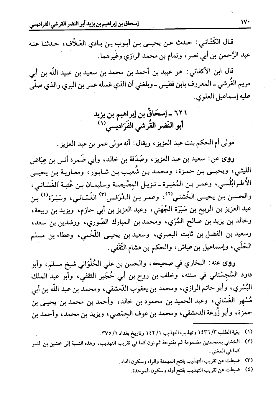 621 - إسحاق بن إبراهيم بن يزيد أبو النضر القرشي الفراديسي (1) مولى أم الحكم بنت عبد العزيز ويقال أنه مولى عمر بن عبد العزيز روى عن سعيد بن عبد العزيز وصدقة بن خالد وأبي ضمرة أنس بن عياض الليثي ويحيى بن حمزة ومحمد بن شعيب بن شابور ومعاوية بن يحيى الأطرابلسي وعمر بن المغيرة نزيل المصيصة وسليمان بن عتبة الغساني والحسن بن يحيى الخشني (2) وعمر بن الدرفس (3) الغساني وسبرة (4) بن عبد العزيز بن الربيع بن سبرة الجهني وعبد العزيز بن أبي حازم ويزيد بن ربيعة وخالد بن يزيد بصالح المري ومحمد بن المبارك الصوري ورشدين بن سعد وسعيد بن الفضل بن ثابت البصري وسعيد بن يحيى اللخمي وعطاء بن مسلم الحلبي وإسماعيل بن عياش والحكم بن هشام الثقفي روى عنه البخاري في صحيحه والحسن بن علي الحلواني شيخ مسلم وأبو داود السجستاني في سننه وخلف بن روح بن أبي حجير الثقفي وأبو عبد الملك البسري وأبو حاتم الرازي ومحمد بن يعقوب الدمشقي ومحمد بن عبد الله بن أبي مسهر الغساني وعبد الحميد بن محمود بن خالد وأحمد بن محمد بن يحيى بن حمزة وأبو زرعة الدمشقي ومحمد بن عوف الحمصي ويزيد بن محمد وأحمد بن