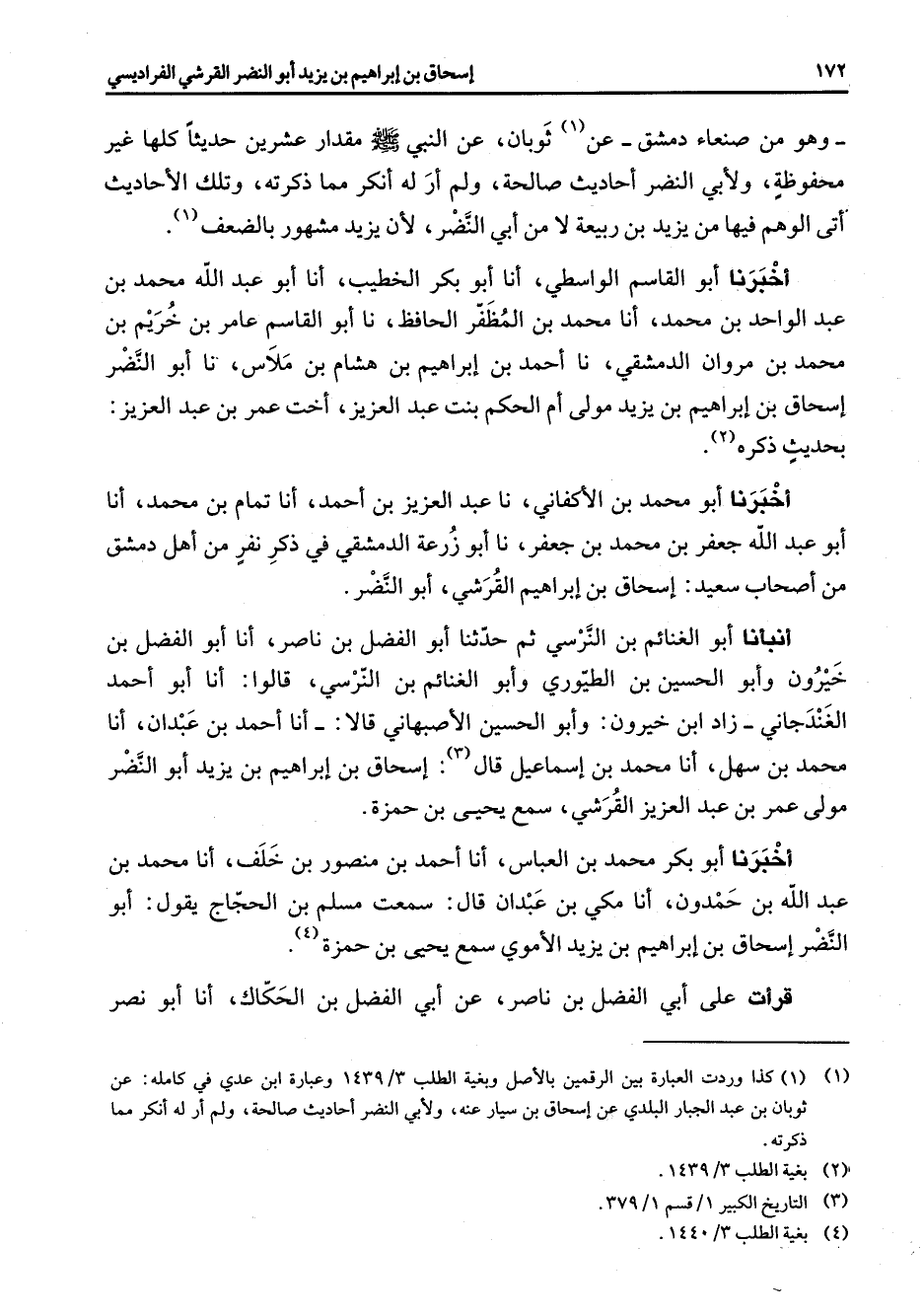 وهو من صنعاء دمشق عن (1) ثوبان عن النبي (صلى الله عليه وسلم) مقدار عشرين حديثا كلها غير محفوظة ولأبي النضر أحاديث صالحة ولم أر له أنكر مما ذكرته وتلك الأحاديث أتى الوهم فيها من يزيد بن ربيعة لا من أبي النضر لأن يزيد مشهور بالضعف (1) أخبرنا أبو القاسم الواسطي أنا أبو بكر الخطيب أنا أبو عبد الله محمد بن عبد الواحد بن محمد أنا محمد بن المظفر الحافظ نا أبو القاسم عامر بن خريم بن محمد بن مروان الدمشقي نا أحمد بن إبراهيم بن هشام بن ملاس نا أبو النضر إسحاق بن إبراهيم بن يزيد مولى أم الحكم بنت عبد العزيز أخت عمر بن عبد العزيز بحديث ذكره (2) أخبرنا أبو محمد بن الأكفاني نا عبد العزيز بن أحمد أنا تمام بن محمد أنا أبو عبد الله جعفر بن محمد بن جعفر نا أبو زرعة الدمشقي في ذكر نفر من أهل دمشق من أصحاب سعيد إسحاق بن إبراهيم القرشي أو النضر أنبأنا أبو الغنائم بن النرسي ثم حدثنا أبو الفضل بن ناصر أنا أبو الفضل بن خيرون وأبو الحسين بن الطيوري وأبو الغنائم بن النرسي قالوا أنا أبو أحمد الغندجاني زاد ابن خيرون وأبو الحسين الأصبهاني قالا أنا أحمد بن عبدان أنا محمد بن سهل أنا محمد بن إسماعيل قال (3) إسحاق بن إبراهيم بن يزيد أبو النضر مولى عمر بن عبد العزيز القرشي سمع يحيى بن حمزة أخبرنا أبو بكر محمد بن العباس أنا أحمد بن منصور بن خلف أنا محمد بن عبد الله بن حمدون أنا مكي بن عبدان قال سمعت مسلم بن الحجاج يقول أبو النضر إسحاق بن إبراهيم بن يزيد الأموي سمع يحيى بن حمزة (4) قرأت على أبي الفضل بن ناصر عن أبي الفضل بن الحكاك أنا أبو نصر