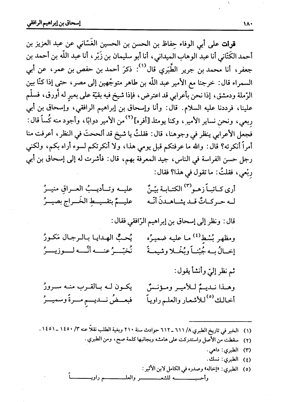 قرأت على أبي الوفاء حفاظ بن الحسن بن الحسين الغساني عن عبد العزيز بن إ أحمد الكتاني أنا عبد الوهاب الميداني أنا أبو سليمان بن زبر أنا عبد الله بن أحمد بن جعفر أنا محمد بن جرير الطبري قال (1) ذكر أحمد بن حفص بن عمر عن أبي السمراء قال خرجنا مع الأمير عبد الله بن طاهر متوجهين إلى مصر حتى إذا كنا بين الرملة ودمشق إذا نحن بأعرابي قد اعترض فإذا شيخ فيه بقية على بعير له أورق فسلم علينا فرددنا عليه السلام قال وأنا وإسحاق بن إبراهيم الرافقي وإسحاق بن أبي ربعي ونحن نساير الأمير وكنا يومئذ أفره (2) من الأمير دوابا وأجود منه كسا قال فجعل الأعرابي ينظر في وجوهنا قال فقلت يا شيخ قد ألححت في النظر أعرفت منا أمرا أنكرته قال والله ما عرفتكم قبل يومي هذا ولا أنكرتكم لسوء أراه بكم ولكني رجل حسن الفراسة في الناس جيد المعرفة بهم قال فأشرت له إلى إسحاق بن أبي ربعي فقلت ما تقول في هذا فقال * أرى كاتبا زهو (3) الكتابة بين * عليه وتأديب العراق منير له حركات قد يشاهدن أنه * عليم بتقسيط الخراج بصير * قال ونظر إلى إسحاق بن إبراهيم الرافقي فقال * ومظهر بسط (4) ما عليه ضميره * يحب الهدايا بالرجال مكور إخال به جبنا وبخلا وشيمة نخبر عنه أنه لوزير * ثم نظر إلي وأنشأ يقول * وهذا نديم للأمير ومؤنس يكون له بالقرب منه سرور أخالك (5) للأشعار والعلم راويا * فبعض نديم مرو سمير *
