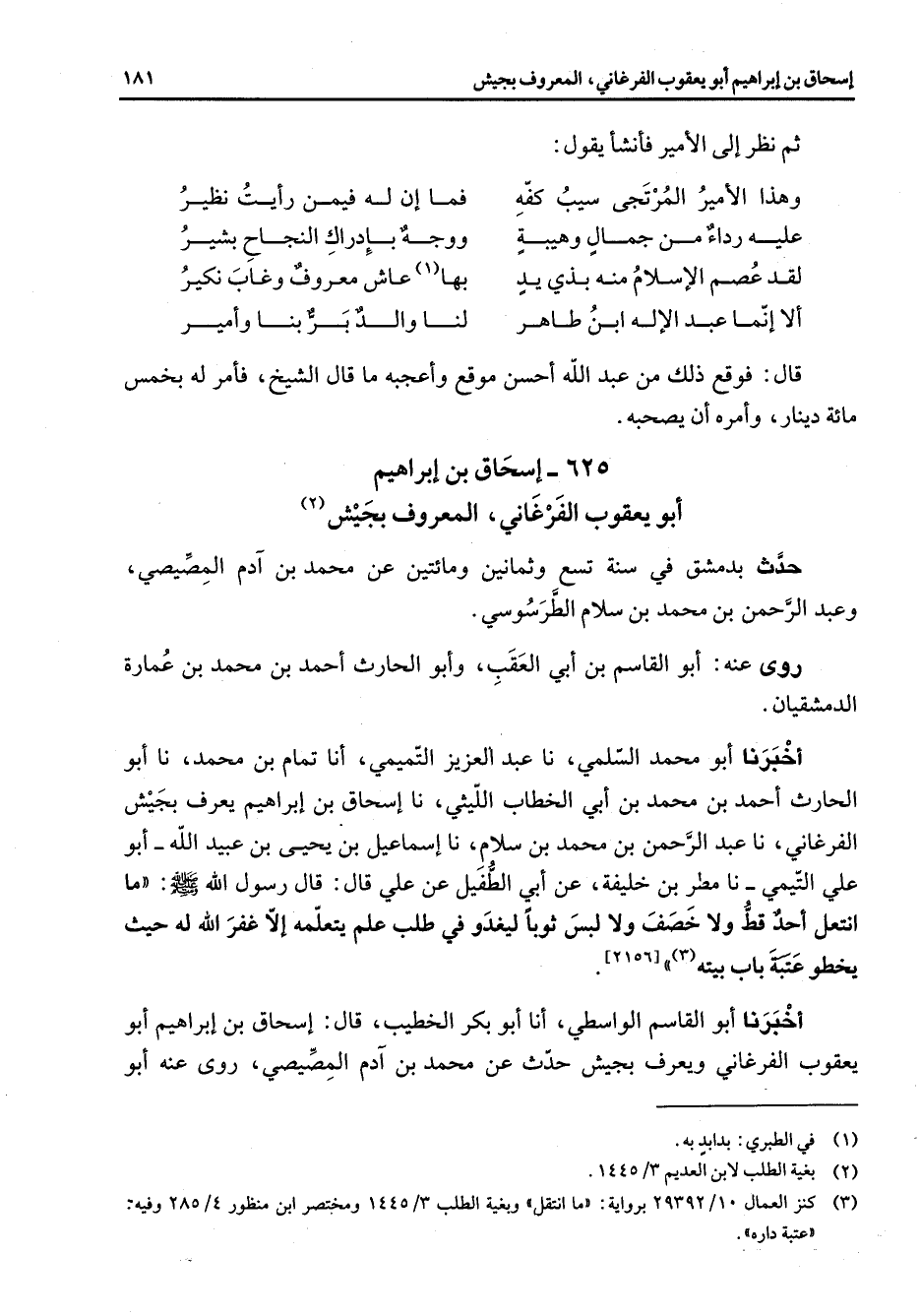 625 - إسحاق بن إبراهيم أبو يعقوب الفرغاني المعروف بجيش (2) حدث بدمشق في سنة تسع وثمانين ومائتين عن محمد بن آدم المصيصي وعبد الرحمن بن محمد بن سلام الطرسوسي روى عنه أبو القاسم بن أبي العقب وأبو الحارث أحمد بن محمد بن عمارة الدمشقيان أخبرنا أبو محمد السلمي نا عبد العزيز التميمي أنا تمام بن محمد نا أبو الحارث أحمد بن محمد بن أبي الخطاب الليثي نا إسحاق بن إبراهيم يعرف بجيش الفرغاني نا عبد الرحمن بن محمد بن سلام نا إسماعيل بن يحيى بن عبيد الله أبو علي التيمي نا مطر بن خليفة عن أبي الطفيل عن علي قال قال رسول الله (صلى الله عليه وسلم) ما انتعل أحد قط ولا خصف ولا لبس ثوبا ليغدو في طلب علم يتعلمه إلا غفر الله له حيث يخطو عتبة باب بيته