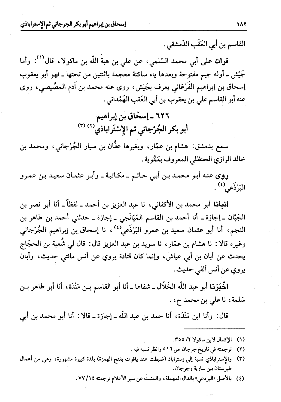 626 - إسحاق بن إبراهيم أبو بكر الجرجاني ثم الاستراباذي (2) (3) سمع بدمشق هشام بن عمار وبغيرها عفان بن سيار الجرجاني ومحمد بن خالد الرازي الحنظلي المعروف بمموية روى عنه أبو محمد بن أبي حاتم مكاتبة وأبو عثمان سعيد بن عمرو البرذعي (9 4 أنبأنا أبو محمد بن الأكفاني نا عبد العزيز بن أحمد لفظا أنا أبو نصر بن الجبان إجازة أنا أحمد بن القاسم الميانجي إجازة حدثني أحمد بن طاهر بن النجم أنا أبو عثمان سعيد بن عمرو البرذعي (4) نا إسحاق بن إبراهيم الجرجاني وغيره قالا نا هشام بن عمار نا سويد بن عبد العزيز قال قال لي شعبة بن الحجاج يحدث عن أبان بن أبي عياش وإنما كان قتادة يروي عن أنس مائتي حديث وأبان يروي عن أنس ألفي حديث أخبرنا أبو عبد الله الخلال شفاها أنا أبو القاسم بن مندة أنا أبو طاهر بن سلمة نا علي بن محمد قال وأنا ابن مندة أنا حمد بن عبد الله إجازة قالا أنا أبو محمد بن أبي