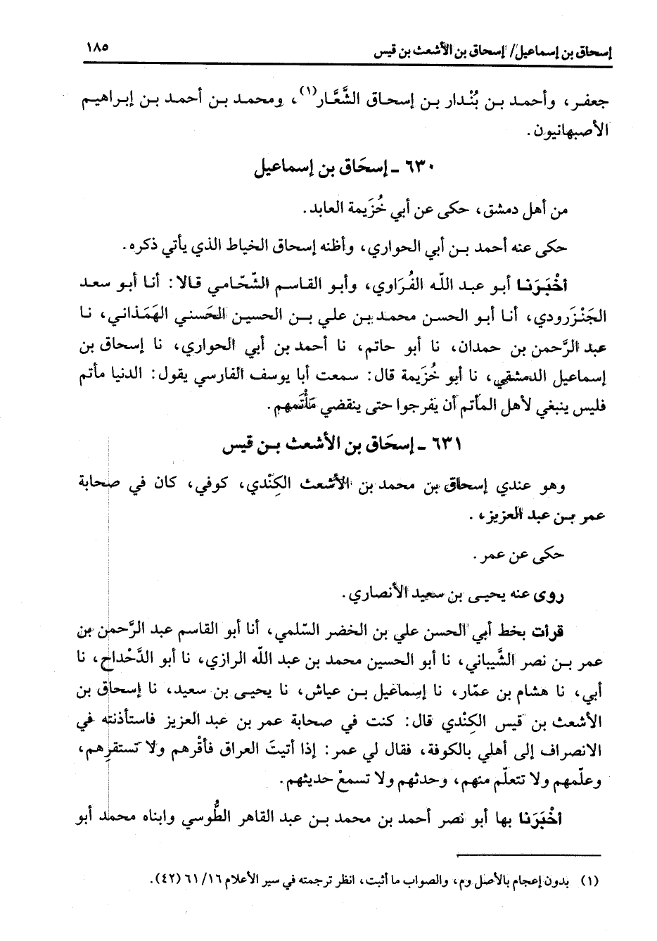 631 - إسحاق بن الأشعث بن قيس وهو عندي إسحاق بن محمد بن الأشعث الكندي كوفي كان في صحابة عمر بن عبد العزيز حكى عن عمر روى عنه يحيى بن سعيد الأنصاري قرأت بخط أبي الحسن علي بن الخضر السلمي أنا أبو القاسم عبد الرحمن بن عمر بن نصر الشيباني نا أبو الحسين محمد بن عبد الله الرازي نا أبو الدحداح نا أبي نا هشام بن عمار نا اسماعيل بن عياش نا يحيى بن سعيد نا إسحاق بن الأشعث بن قيس الكندي قال كنت في صحابة عمر بن عبد العزيز فاستأذنته في الانصراف إلى أهلي بالكوفة فقال لي عمر إذا أتيت العراق فأقرهم ولا تستقرهم وعلمهم ولا تتعلم منهم وحدثهم ولا تسمع حديثهم أخبرنا بها أبو نصر أحمد بن محمد بن عبد القاهر الطوسي وابناه محمد أبو