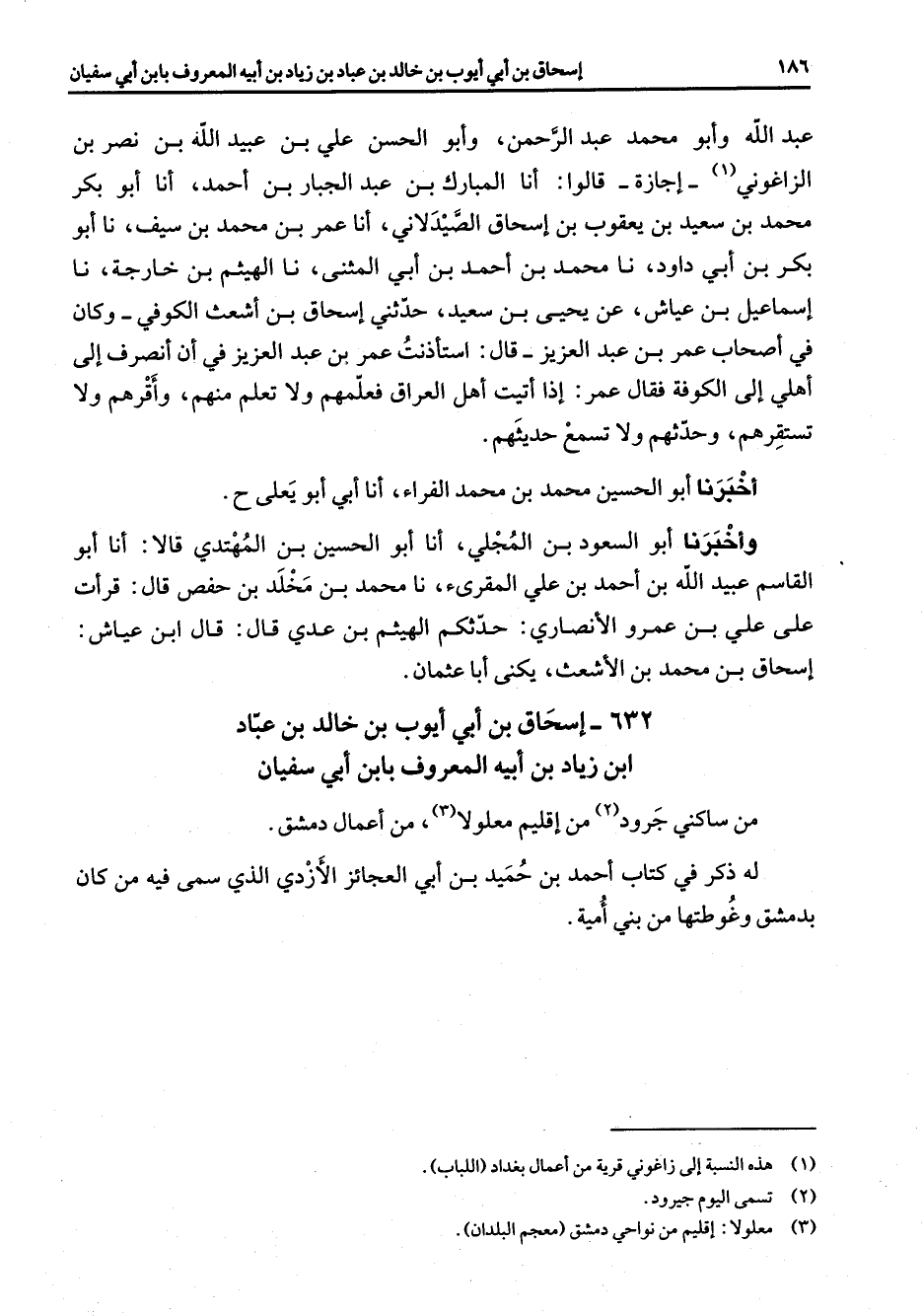 عبد الله وأبو محمد عبد الرحمن وأبو الحسن علي بن عبيد الله بن نصر بن الزاعوني (1) إجازة قالوا أنا المبارك بن عبد الجبار بن أحمد أنا أبو بكر محمد بن سعيد بن يعقوب بن إسحاق الصيدلاني أنا عمر بن محمد بن سيف نا أبو بكر بن أبي داود نا محمد بن أحمد بن أبي المثنى نا الهيثم بن خارجة نا إسماعيل بن عياش عن يحيى بن سعيد حدثني إسحاق بن أشعث الكوفي وكان في أصحاب عمر بن عبد العزيز قال استأذنت عمر بن عبد العزيز في أن أنصرف إلى أهلي إلى الكوفة فقال عمر إذا أتيت أهل العراق فعلمهم ولا تعلم منهم وأقرهم ولا تستقرهم وحدثهم ولا تسمع حديثهم أخبرنا أبو الحسين محمد بن محمد الفراء أنا أبي أبو يعلى وأخبرنا أبو السعود بن المجلي أنا أبو الحسين بن المهتدي قالا أنا أبو القاسم عبيد الله بن أحمد بن علي المقرئ نا محمد بن مخلد بن حفص قال قرأت على علي بن عمرو الأنصاري حدثكم الهيثم بن عدي قال قال ابن عياش إسحاق بن محمد بن الأشعث يكنى أبا عثمان 632 إسحاق بن أبي أيوب بن خالد بن عباد ابن زياد بن أبى المعروف بابن أبي سفيان من ساكني جرود (2) من إقليم معلولا (3) من أعمال دمشق له ذكر في كتاب أحمد بن حميد بن أبي العجائز الأزدي الذي سمى فيه من كان بدمشق وغوطتها من بني أمية