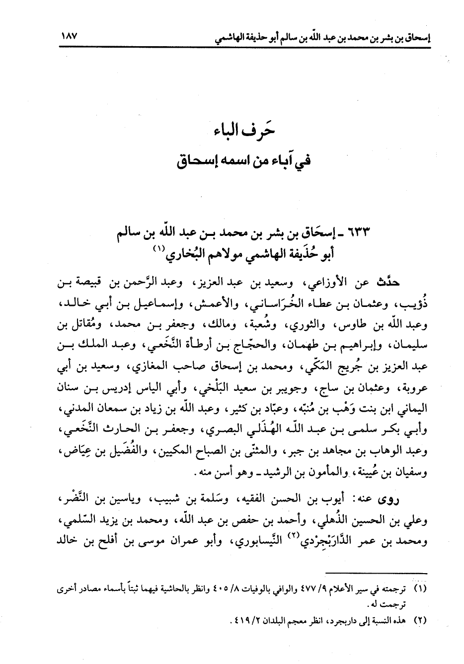 633 - إسحاق بن بشر بن محمد بن عبد الله بن سالم أبو حذيفة الهاشمي مولاهم البخاري (1) حدث عن الأوزاعي وسعيد بن عبد العزيز وعبد الرحمن بن قبيصة بن ذؤيب وعثمان بن عطاء الخراساني والأعمش وإسماعيل بن أبي خالد وعبد الله بن طاوس والثوري وشعبة ومالك وجعفر بن محمد ومقاتل بن سليمان وإبراهيم بن طهمان والحجاج بن أرطأة النخعي وعبد الملك بن عبد العزيز بن جريج المكي ومحمد بن إسحاق صاحب المغازي وسعيد بن أبي عروبة وعثمان بن ساج وجويبر بن سعيد البلخي وأبي إلياس إدريس بن سنان اليماني ابن بنت وهب بن منبه وعباد بن كثير وعبد الله بن زياد بن سمعان المدني وأبي بكر سلمى بن عبد الله الهذلي البصري وجعفر بن الحارث النخعي وعبد الوهاب بن مجاهد بن جبر والمثنى بن الصباح المكيين والفضيل بن عياض وسفيان بن عيينة والمأمون بن الرشيد وهو أسن منه روى عنه أيوب بن الحسن الفقيه وسلمة بن شبيب وياسين بن النضر وعلي بن الحسين الذهلي وأحمد بن حفص بن عبد الله ومحمد بن يزيد السلمي ومحمد بن عمر الداربجردي (2) النيسابوري وأبو عمران موسى بن أفلح بن خالد