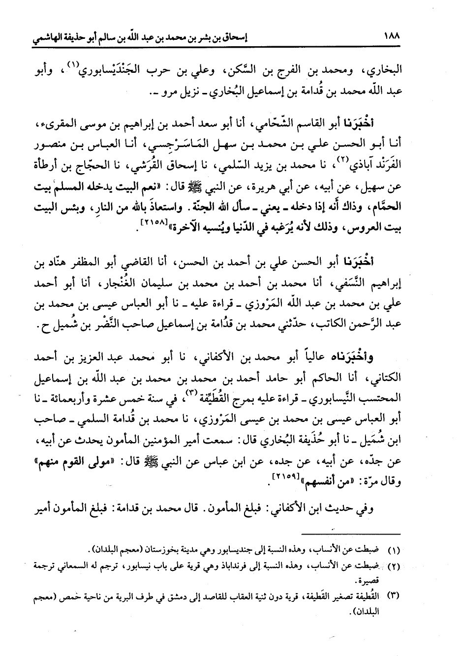 [2158] أخبرنا أبو الحسن علي بن أحمد بن الحسن أنا القاضي أبو المظفر هناد بن إبراهيم النسفي أنا محمد بن أحمد بن محمد بن سليمان الغنجار أنا أبو أحمد علي بن محمد بن عبد الله المروزي قراءة عليه نا أبو العباس عيسى بن محمد بن عبد الرحمن الكاتب حدثني محمد بن قدامة بن إسماعيل صاحب النضر بن شميل وأخبرناه عاليا أبو محمد بن الأكفاني نا أبو محمد عبد العزيز بن أحمد الكتاني أنا الحاكم أبو حامد أحمد بن محمد بن محمد بن عبد الله بن إسماعيل المحتسب النيسابوري قراءة عليه بمرج القطيفة (3) في سنة خمس عشرة وأربعمائة نا أبو العباس عيسى بن محمد بن عيسى المروزي نا محمد بن قدامة السلمي صاحب ابن شميل نا أبو حذيفة البخاري قال سمعت أمير المؤمنين المأمون يحدث عن أبيه عن جده عن أبيه عن جده عن ابن عباس عن النبي (صلى الله عليه وسلم) قال مولى القوم منهم وقال مرة من أنفسهم
