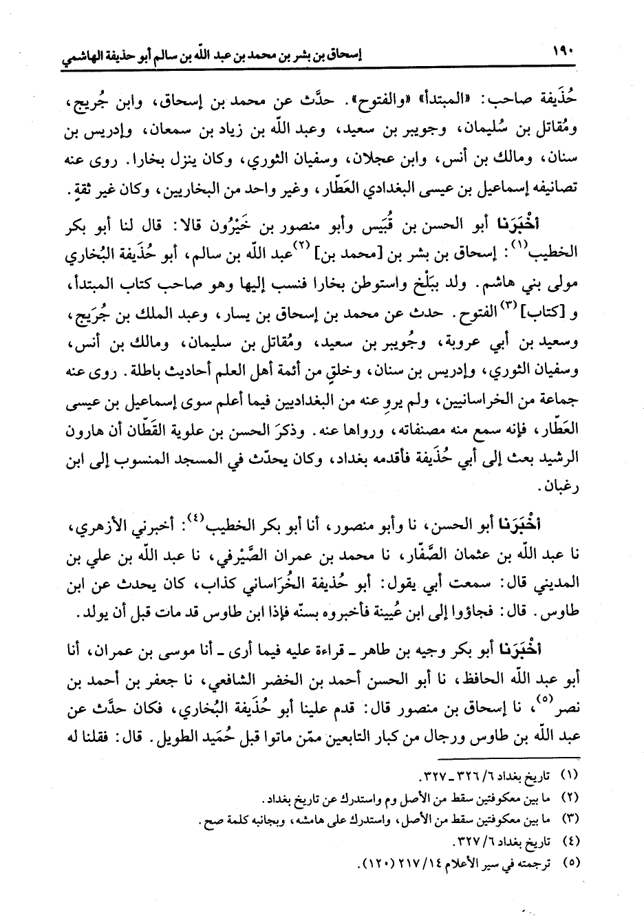 حذيفة صاحب - المبتدأ - والفتوح - حدث عن محمد بن إسحاق وابن جريج ومقاتل بن سليمان وجويبر بن سعيد وعبد الله بن زياد بن سمعان وإدريس بن سنان ومالك بن أنس وابن عجلان وسفيان الثوري وكان ينزل بخارا روى عنه تصانيفه إسماعيل بن عيسى البغدادي العطار وغير واحد من البخاريين وكان غير ثقة أخبرنا أبو الحسن بن قبيس وأبو منصور بن خيرون قالا قال لنا أبو بكر الخطيب (1) إسحاق بن بشر بن محمد بن عبد الله بن سالم أبو حذيفة البخاري مولى بني هاشم ولد ببلخ واستوطن بخارا فنسب إليها هو صاحب - كتاب المبتدأ - و - كتاب (3) الفتوح - حدث عن محمد بن إسحاق بن يسار وعبد الملك بن جريج وسعيد بن أبي عروبة وجويبر بن سعيد ومقاتل بن سليمان ومالك بن أنس وسفيان الثوري وإدريس بن سنان وخلق من أئمة أهل العلم أحاديث باطلة روى عنه جماعة من الخراسانيين ولم يرو عنه من البغداديين فيما أعلم سوى إسماعيل بن عيسى العطار فإنه سمع منه مصنفاته ورواها عنه وذكر الحسن بن علوية القطان أن هارون الرشيد بعث إلى أبي حذيفة فأقدمه بغداد وكان يحدث في المسجد المنسوب إلى ابن رغبان أخبرنا أبو الحسن نا وأبو منصور أنا أبو بكر الخطيب (4) أخبرني الأزهري نا عبد الله بن عثمان الصفار نا محمد بن عمران الصيرفي نا عبد الله بن علي بن المديني قال سمعت أبي يقول أبو حذيفة الخراساني كذاب كان يحدث عن ابن طاوس قال فجاؤوا إلى ابن عيينة فأخبروه بسنه فإذا ابن طاوس قد مات قبل أن يولد أخبرنا أبو بكر وجيه بن طاهر قراءة عليه فيما أرى أنا موسى بن عمران أنا أبو عبد الله الحافظ نا أبو الحسن أحمد بن الخضر الشافعي نا جعفر بن أحمد بن نصرنا (5) إسحاق بن منصور قال قدم علينا أبو حذيفة البخاري فكان حدث عن عبد الله بن طاوس ورجال من كبار التابعين ممن ماتوا حميد الطويل قال فقلنا له