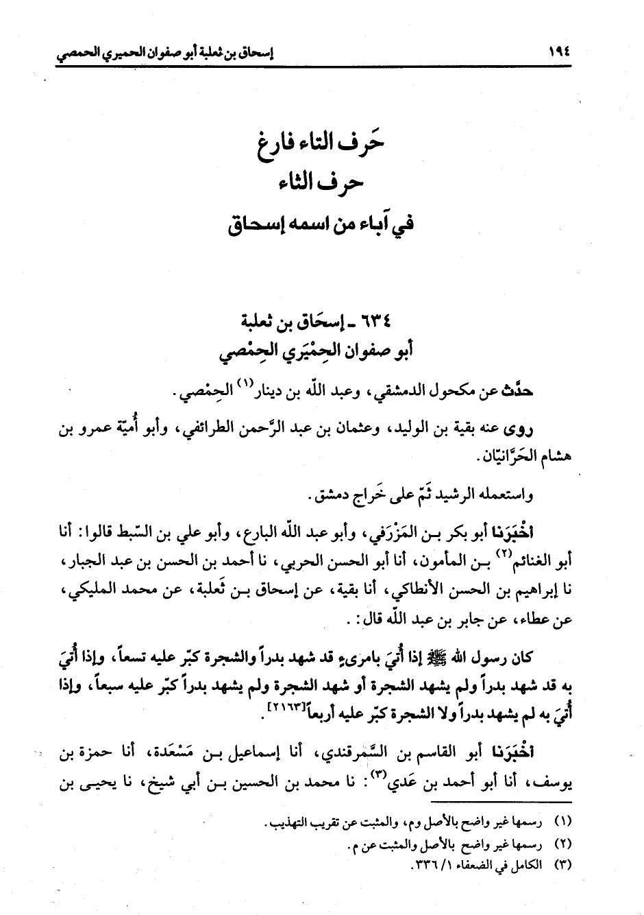 634 - إسحاق بن ثعلبة أبو صفوان الحميري الحمصي حدث عن مكحول الدمشقي وعبد الله بن دينار (1) الحمصي روى عنه بقية بن الوليد وعثمان بن عبد الرحمن الطرائفي وأبو أمية عمرو بن هشام الحرانيان واستعمله الرشيد ثم على خراج دمشق أخبرنا أبو بكر بن المزرفي وأبو عبد الله البارع وأبو علي بن السبط قالوا أنا أبو الغنائم (2) بن المأمون أنا أبو الحسن الحربي نا أحمد بن الحسن بن عبد الجبار نا إبراهيم بن الحسن الأنطاكي أنا بقية عن إسحاق بن ثعلبة عن محمد المليكي عن عطاء عن جابر بن عبد الله قال كان رسول الله (صلى الله عليه وسلم) إذا أتي بامرئ قد شهد بدرا والشجرة كبر عليه تسعا وإذا أتي به قد شهد بدرا ولم يشهد الشجرة أو شهد الشجرة ولم يشهد بدرا كبر عليه سبعا وإذا أتي به لم يشهد بدرا ولا الشجرة كبر عليه أربعا