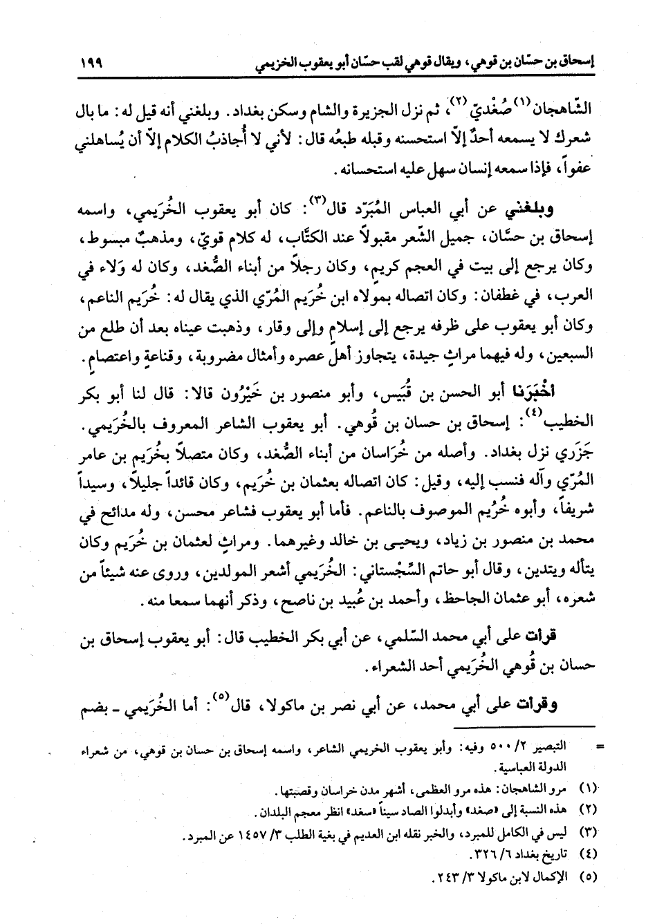 - التبصير 2 / 500 وفيه: وأبو يعقوب الخريمي الشاعر واسمه إسحاق بن حسان بن قوهي من شعراء الدولة العباسية