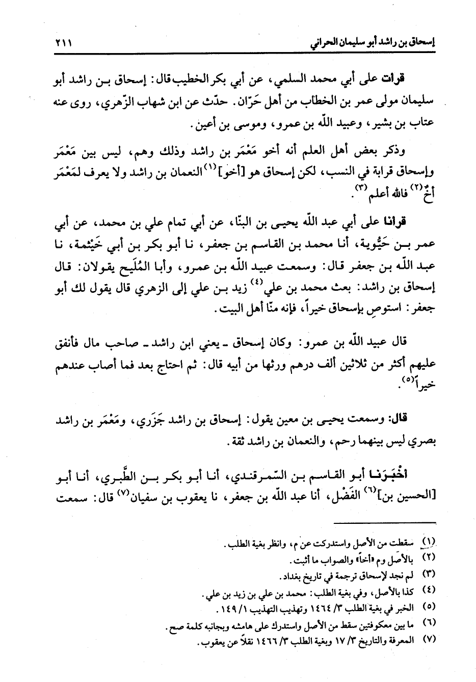 قرأت على أبي محمد السلمي عن أبي بكر الخطيب قال إسحاق بن راشد أبو سليمان مولى عمر بن الخطاب من أهل حران حدث عن ابن شهاب الزهري روى عنه عتاب بن بشير وعبيد الله بن عمرو وموسى بن أعين وذكر بعض أهل العلم أنه أخو معمر بن راشد وذلك وهم ليس بين معمر وإسحاق قرابة في النسب لكن إسحاق هو أخو (1) النعمان بن راشد ولا يعرف لمعمر أخ (2) فالله أعلم (3) قرأنا على أبي عبد الله يحيى بن البنا عن أبي تمام علي بن محمد عن أبي عمر بن حيوية أنا محمد بن القاسم بن جعفر نا أبو بكر بن أبي خيثمة نا عبد الله بن جعفر قال وسمعت عبيد الله بن عمرو وأبا المليح يقولان قال إسحاق براشد بعث محمد بن علي (4) زيد بن علي إلى الزهري قال يقول لك أبو جعفر استوص بإسحاق خيرا فإنه منا أهل البيت قال عبيد الله بن عمرو وكان إسحاق يعني ابن راشد صاحب مال فأنفق عليهم أكثر من ثلاثين ألف درهم ورثها من أبيه قال ثم احتاج بعد فما أصاب عندهم خيرا (5) قال وسمعت يحيى بن معين يقول إسحاق بن راشد جزري ومعمر بن راشد بصري ليس بينهما رحم والنعمان بن راشد ثقة أخبرنا أبو القاسم بن السمرقندي أنا أبو بكر بن الطبري أنا أبو الحسين بن (6) الفضل أنا عبد الله بن جعفر نا يعقوب بن سفيان (7) قال سمعت