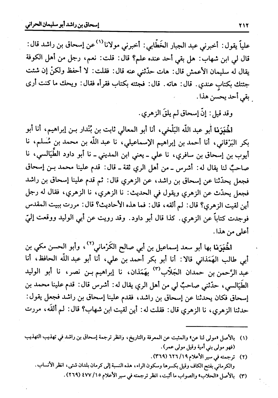 عليا يقول أخبرني عبد الجبار الخطابي أخبرني مولانا (1) عن إسحاق بن راشد قال قال لي ابن شهاب هل بقي أحد عنده علم قال قلت نعم رجل من أهل الكوفة يقال له سليمان الأعمش قال هات حدثني عنه قال فقلت لا أحفظ ولكن إن شئت جئتك بكتاب عندي قال هاته قال فجئته بكتاب فقرأه فقال ويحك ما كنت أرى بقي أحد يحسن هذا وقد قيل إن إسحاق لم يلق الزهري أخبرنا أبو عبد الله البلخي أنا أبو المعالي ثابت بن بندار بن إبراهيم أنا أبو بكر البرقاني أنا أحمد بن إبراهيم الإسماعيلي نا عبد الله بن محمد بن مسلم نا أيوب بن إسحاق بن سافري نا علي يعني ابن المديني نا أبو داود الطيالسي نا صاحب لنا يقال له أشرس من أهل الري ثقة قال قدم علينا محمد بن إسحاق فجعل يحدثنا عن إسحاق بن راشد عن الزهري قال ثم قدم علينا إسحاق بن راشد فجعل يحدث عن الزهري ويقول في الحديث نا الزهري نا الزهري فقال له رجل أين لقيت الزهري قال لم ألقه قال فما هذه الأحاديث قال مررت ببيت المقدس فوجدت كتابا عن الزهري كذا قال أبو داود وقد رويت عن أبي الوليد ووقعت إلي أعلى من هذا أخبرنا بها أبو سعد إسماعيل بن أبي صالح الكرماني (2) وأبو الحسن مكي بن أبي طالب الهمذاني قالا أنا أبو بكر أحمد بن علي أنا أبو عبد الله الحافظ أنا عبد الرحمن بن حمدان الجلاب (3) بهمذان نا إبراهيم بن نصر نا أبو الوليد الطيالسي حدثني صاحب لي من أهل الري يقال له أشرس قال قدم علينا محمد بن إسحاق فكان يحدثنا عن إسحاق بن راشد فقدم علينا إسحاق بن راشد فجعل يقول حدثنا الزهري نا الزهري قال فقلت له أين لقيت ابن شهاب قال لم ألقه مررت