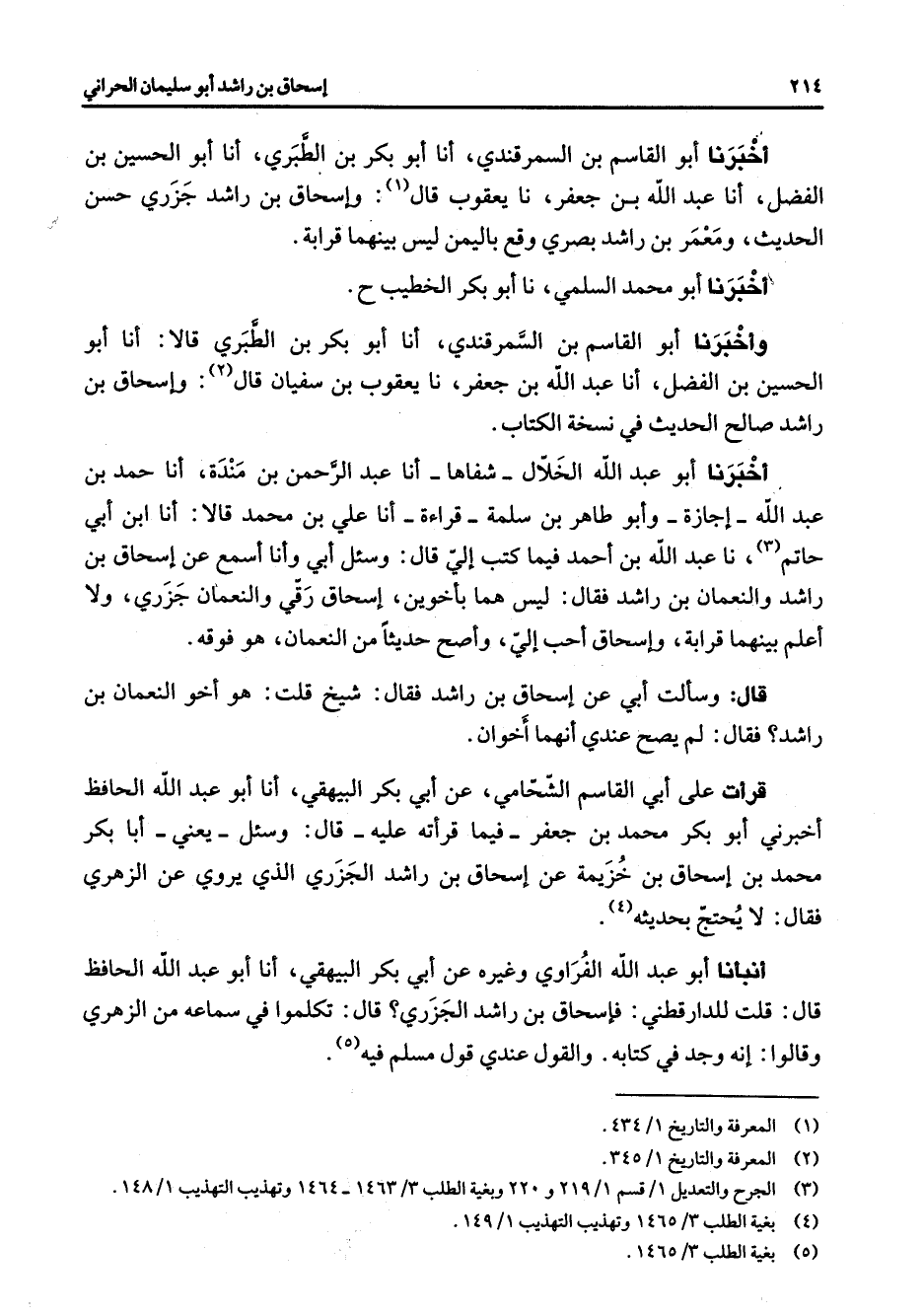 أخبرنا أبو القاسم بن السمرقندي أنا أبو بكر بن الطبري أنا أبو الحسين بن الفضل أنا عبد الله بن جعفر نا يعقوب قال (1) وإسحاق بن راشد جزري حسن الحديث ومعمر بن راشد بصري وقع باليمن ليس بينهما قرابة أخبرنا أبو محمد السلمي نا أبو بكر الخطيب وأخبرنا أبو القاسم بن السمرقندي أنا أبو بكر بن الطبري قالا أنا أبو الحسين بن الفضل أنا عبد الله بن جعفر نا يعقوب بن سفيان قال وإسحاق بن راشد صالح الحديث في نسخة الكتاب أخبرنا أبو عبد الله الخلال شفاها أنا عبد الرحمن بن مندة أنا حمد بن عبد الله إجازة وأبو طاهر بن سلمة قراءة أنا علي بن محمد قالا أنا ابن أبي حاتم (3) نا عبد الله بن أحمد فيما كتب إلي قال وسئل أبي وأنا أسمع عن إسحاق بن راشد والنعمان بن راشد فقال ليس هما بأخوين إسحاق رقي والنعمان جزري ولا أعلم بينهما قرابة وإسحاق أحب إلي وأصح حديثا من النعمان هو فوقه قال وسألت أبى عن إسحاق بن راشد فقال شيخ قلت هو أخو النعمان بن راشد فقال لم يصح عندي أنهما أخوان قرأت على أبي القاسم الشحامي عن أبي بكر البيهقي أنا أبو عبد الله الحافظ أخبرني أبو بكر محمد بن جعفر فيما قرأته عليه قال وسئل يعني أبا بكر محمد بن إسحاق بن خزيمة عن إسحاق بن راشد الجزري الذي يروي عن الزهري فقال لا يحتج بحديثه (4) أنبأنا أبو عبد الله الفراوي وغيره عن أبي بكر البيهقي أنا أبو عبد الله الحافظ قال قلت للدارقطني فإسحاق بن راشد الجزري قال تكلموا في سماعه من الزهري وقالوا إنه وجد في كتابه والقول عندي قول مسلم فيه (5)