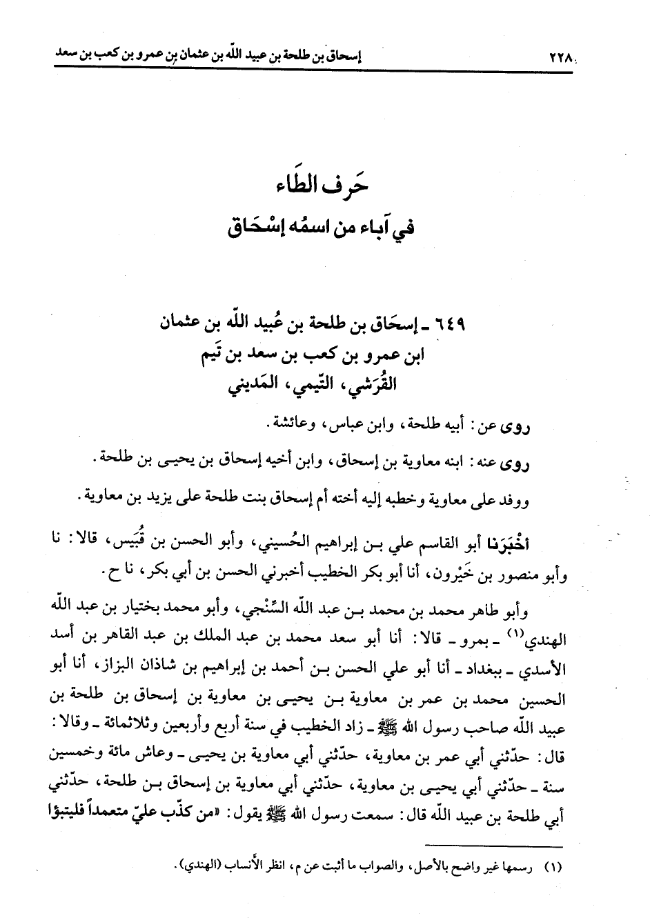 649 - إسحاق بن طلحة بن عبيد الله بن عثمان ابن عمرو بن كعب بن سعد بن تيم القرشي التيمي المديني روى عنه أبيه طلحة وابن عباس وعائشة روى عنه ابنه معاوية بن إسحاق وابن أخيه إسحاق بن يحيى بن طلحة ووفد على معاوية وخطبه إليه أخته أم إسحاق بنت طلحة على يزيد بن معاوية أخبرنا أبو القاسم علي بن إبراهيم الحسيني وأبو الحسن بن قبيس قالا نا وأبو منصور بن خيرون أنا أبو بكر الخطيب أخبرني الحسن بن أبي بكر نا وأبو طاهر محمد بن محمد بن عبد الله السنجي وأبو محمد بختيار بن عبد الله الهندي (1) بمرو قالا أنا أبو سعد محمد بن عبد الملك بن عبد القاهر بن أسد الأسدي ببغداد أنا أبو علي الحسن بن أحمد بن إبراهيم بن شاذان البزاز أنا أبو الحسين محمد بن عمر بن معاوية بن يحيى بن معاوية بن إسحاق بن طلحة بن عبيد الله صاحب رسول الله (صلى الله عليه وسلم) زاد الخطيب في سنة أربع وأربعين وثلاثمائة وقالا قال حدثني أبي عمر بن معاوية حدثني أبي معاوية بن يحيى وعاش مائة وخمسين سنة حدثني أبي يحيى بن معاوية حدثني أبي معاوية بن إسحاق بن طلحة حدثني أبي طلحة بن عبيد الله قال سمعت رسول الله (صلى الله عليه وسلم) يقول من كذب علي متعمدا فليتبؤأ