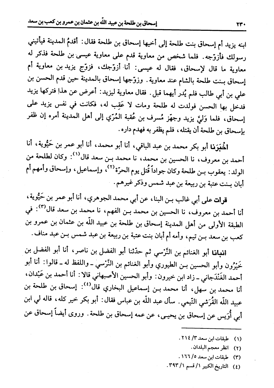 ابنه يزيد أم إسحاق بنت طلحة إلى أخيها إسحاق بن طلحة فقال أقدم المدينة فيأتيني رسولك فأزوجه فلما شخص من معاوية قدم على معاوية عيسى بن طلحة فذكر له معاوية ما قال لإسحاق فقال له عيسى أنا أزوجك فزوج يزيد بن معاوية أم إسحاق بنت طلحة بالشام عند معاوية وزوجها إسحاق بالمدينة حين قدم الحسن بن علي بن أبي طالب فلم يدر أيهما قبل فقال معاوية ليزيد أعرض عن هذا فتركها يزيد فدخل بها الحسن فولدت له طلحة ومات لا عقب له فكانت في نفس يزيد على إسحاق فلما ولي يزيد وجهز مسرف بن عقبة المري إلى أهل المدينة أمره إن ظفر بإسحاق بن طلحة أن يقتله فلم يظفر به فهدم داره أخبرنا أبو بكر محمد بن عبد الباقي أنا أبو محمد أنا أبو عمر بن حيوية أنا أحمد بن معروف نا الحسين بن محمد نا محمد بن سعد قال (1) وكان لطلحة من الولد يعقوب بن طلحة وكان جوادا قتل يوم الحرة (2) وإسماعيل وإسحاق وأمهم أم أبان بنت عتبة بن ربيعة بن عبد شمس وذكر غيرهم قرأت على أبي غالب بن البنا عن أبي محمد الجوهري أنا أبو عمر بن حيوية أنا أحمد بن معروف نا الحسين بن محمد بن الفهم نا محمد بن سعد قال (3) في الطبقة الأولى من أهل المدينة إسحاق بن طلحة بن عبيد الله بن عثمان بن عمرو بن كعب بن سعد بن تيم وأمه أم أبان بنت عتبة بن ربيعة بن عبد شمس بن عبد مناف أنبأنا أبو الغنائم بن النرسي ثم حدثنا أبو الفضل بن ناصر أنا أبو الفضل بن خيرون وأبو الحسين بن الطيوري وأبو الغنائم بن النرسي واللفظ له قالوا أنا أبو أحمد الغندجاني زاد ابن خيرون وأبو الحسين الأصبهاني قالا أنا أحمد بن عبدان أنا محمد بن سهل أنا محمد بن إسماعيل البخاري قال إسحاق بن طلحة بن عبيد الله القرشي التيمي سأل عبد الله بن عباس فقال أبو بكر خير كله قاله لي ابن أبي أويس عن إسحاق بن يحيى عن عمه إسحاق بن طلحة وروى أيضا إسحاق عن