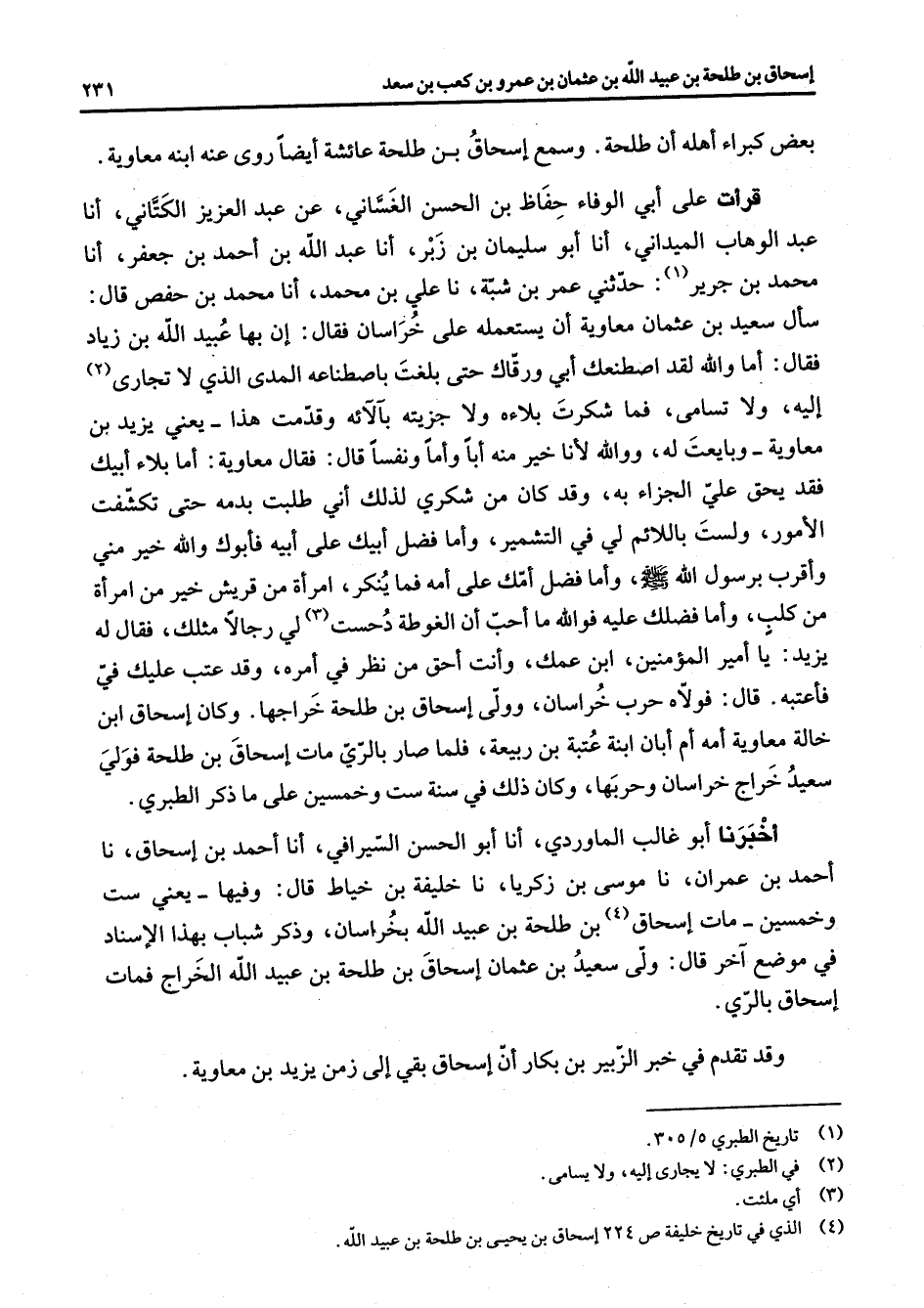 (4) الذي في تاريخ خليفة ص 224 إسحاق بن يحيى بن طلحة بن عبيد الله