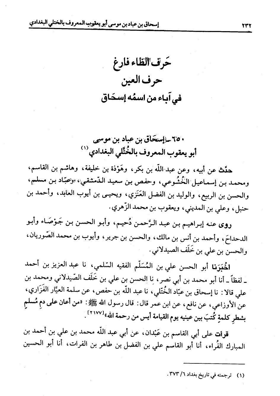 650 - إسحاق بن عباد بن موسى أبو يعقوب المعروف بالختلي البغدادي (1) حدث عن أبيه وعن عبد الله بن بكر وهوذة بن خليفة وهاشم بن القاسم ومحمد بن إسماعيل الخشوعي وحفص بن سعيد الدمشقي وعباد بن مسلم والحسن بن ربيع والوليد بن الفضل العنزي ويحيى بن أيوب العابد وأحمد بن حنبل وعلي بن المديني ويعقوب بن محمد الزهري روى عنه إبراهيم بن عبد الرحمن دحيم وأبو الحسن بن جوصاء وأبو الدحداح وأحمد بن أنس بن مالك والحسن بن جرير وأيوب بن محمد الصوريان والحسن بن علي بن خلف الصيدلاني أخبرنا أبو الحسن بن علي بن المسلم الفقيه السلمي نا عبد العزيز بن أحمد لفظا أنا أبو محمد بن أبي نصر نا الحسن بن علي بن خلف الصيدلاني ومحمد بن علي قالا نا إسحاق بن عباد الختلي نا عبد الله بن حفص عن سلمة العيار الفزاري عن الأوزاعي عن نافع عن ابن عمر قال قال رسول الله (صلى الله عليه وسلم) من أعان على دم مسلم بشطر كلمة كتب بين عينيه يوم القيامة أيس من رحمة الله