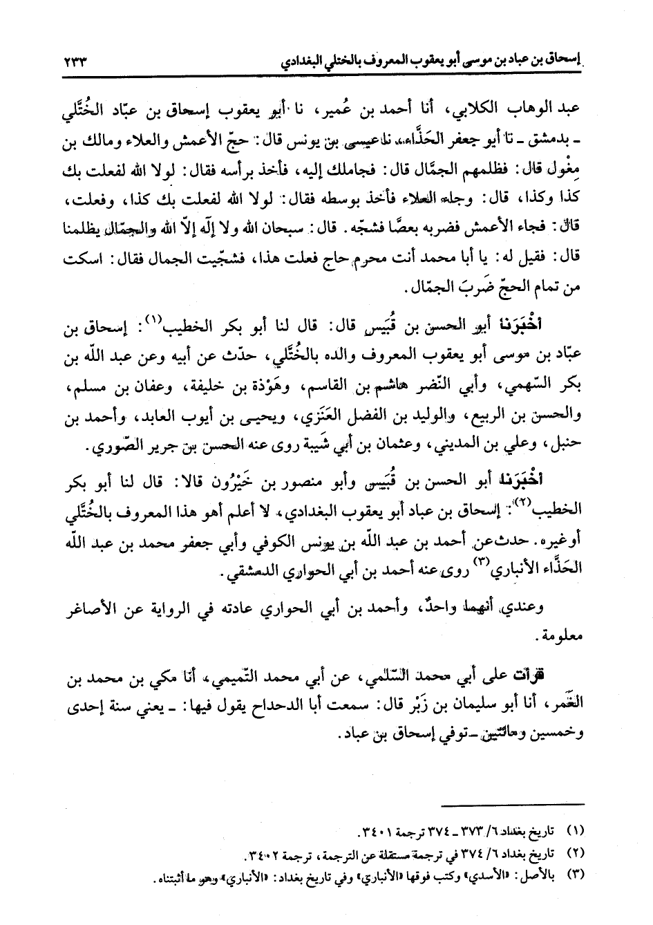 (2) تاريخ بغداد 6 / 374 في ترجمة مستقلة عن الترجمة ترجمة 3402