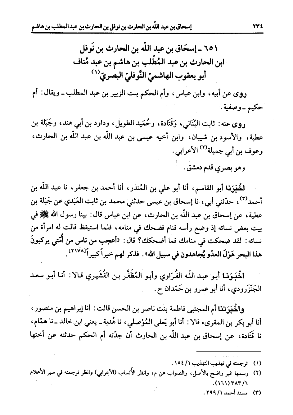 651 - إسحاق بن عبد الله بن الحارث بن نوفل ابن الحارث بن عبد المطلب بن هاشم بن عبد مناف أبو يعقوب الهاشمي النوفلي البصري (1) روى عن أبيه وابن عباس وأم الحكم بنت الزبير بن عبد المطلب ويقال أم حكيم وصفية روى عنه ثابت البناني وقتادة وحميد الطويل وداود بن أبي هند وجبلة بن عطية والأسود بن شيبان وابن أخيه عيسى بن عبد الله بن عبد الله بن الحارث وعوف بن أبي جميلة (2) الأعرابي وهو بصري قدم دمشق أخبرنا أبو القاسم أنا أبو علي بن المنذر أنا أحمد بن جعفر نا عبد الله بن أحمد (3) حدثني أبي نا إسحاق بن عيسى حدثني محمد بن ثابت العبدي عن جبلة بن عطية عن إسحاق بن عبد الله بن الحارث عن ابن عباس قال بينا رسول الله (صلى الله عليه وسلم) في بيت بعض نسائه إذ وضع رأسه فنام فضحك في منامه فلما استيقظ قالت له امرأة من نسائه لقد ضحكت في منامك فما أضحكك قال أعجب من ناس من أمتي يركبون هذا البحر هول العدو يجاهدون في سبيل الله فذكر لهم خيرا كبيرا