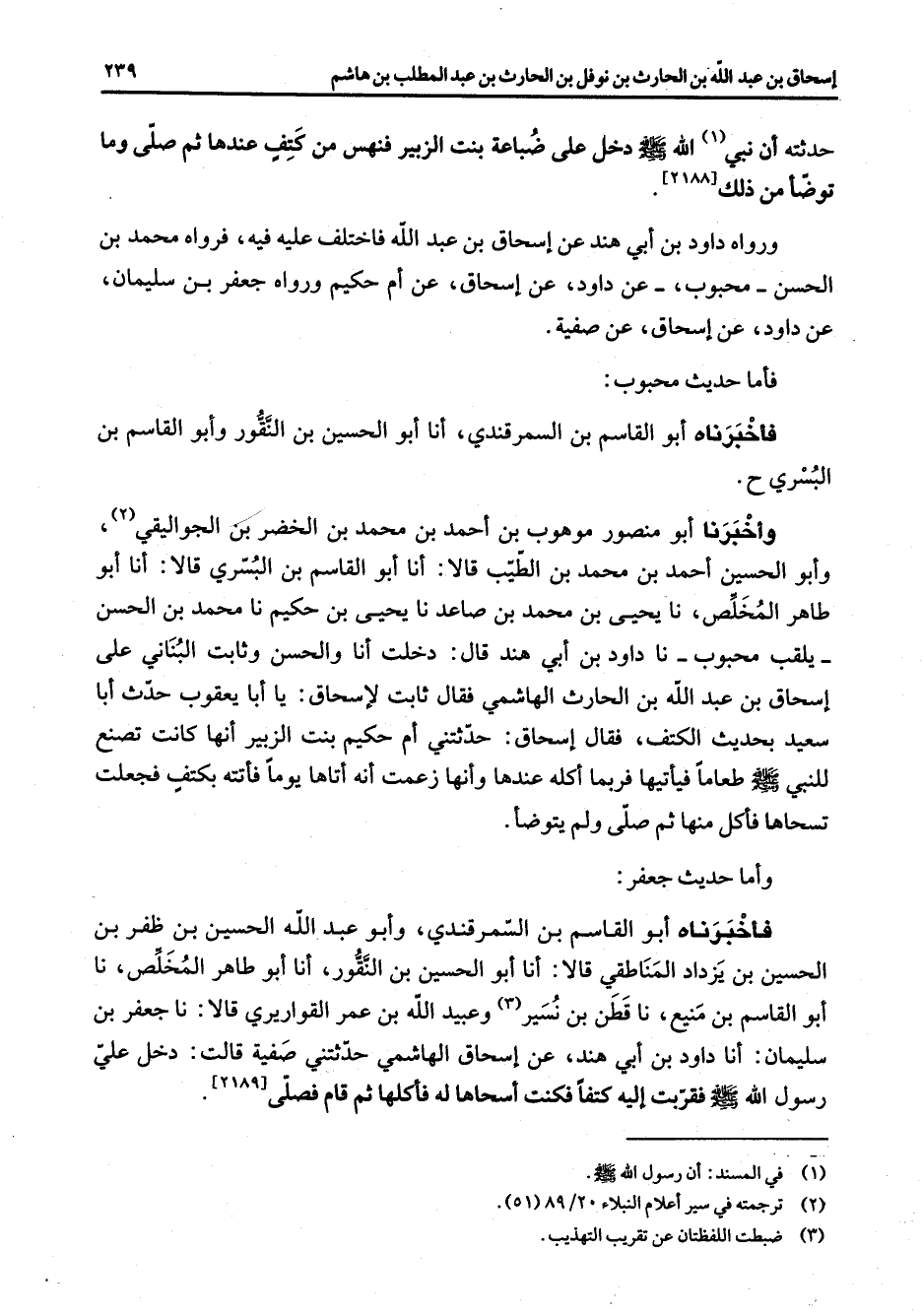 [2188] ورواه داود بن أبي هند عن إسحاق بن عبد الله فاختلف عليه فيه فرواه محمد بن الحسن محبوب عن داود عن إسحاق عن أم حكيم ورواه جعفر بن سليمان عن داود عن إسحاق عن صفية فأما حديث محبوب فأخبرناه أبو القاسم بن السمرقندي أنا أبو الحسين بن النقور وأبو القاسم بن البسري وأخبرنا أبو منصور موهوب بن أحمد بن محمد بن الخضر بن الجواليقي (2) وأبو الحسين أحمد بن محمد بن الطيب قالا أنا أبو القاسم بن البسري قالا أنا أبو طاهر المخلص نا يحيى بن محمد بن صاعد نا يحيى بن حكيم نا محمد بن الحسن يلقب محبوب نا داود بن أبي هند قال دخلت أنا والحسن وثابت البناني على إسحاق بن عبد الله بن الحارث الهاشمي فقال ثابت لإسحاق يا أبا يعقوب حدث أبا سعيد بحديث الكتف فقال إسحاق حدثني أم حكيم بنت الزبير أنها كانت تصنع للنبي (صلى الله عليه وسلم) طعاما فيأتيها فربما أكله عندها وأنها زعمت أنه أتاها يوما فأتته بكتف فجعلت تسحاها فأكل منها ثم صلى ولم يتوضأ وأما حديث جعفر فأخبرناه أبو القاسم بن السمرقندي وأبو عبد الله الحسين بن ظفر بن الحسين بن يزداد المناطقي قالا أنا أبو الحسين بن النقور أنا أبو طاهر المخلص نا أبو القاسم بن منيع نا قطن بن (3) نسير وعبيد الله بن عمر القواريري قالا نا جعفر بن سليمان أنا داود بن أبي هند عن إسحاق الهاشمي حدثتني صفية قالت دخل علي رسول الله (صلى الله عليه وسلم) فقربت إليه كتفا فكنت أسحاها له فأكلها ثم قام فصلى