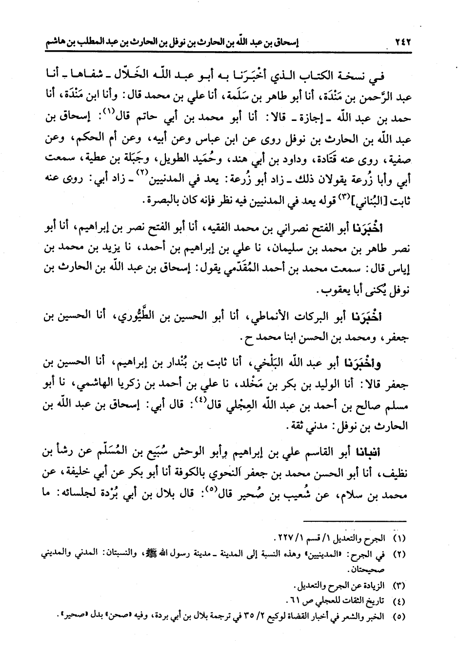 في نسخة الكتاب الذي أخبرنا به أبو عبد الله الخلال شفاها أنا عبد الرحمن بن مندة أنا أبو طاهر بن سلمة أنا علي بن محمد قال وأنا ابن مندة أنا حمد بن عبد الله إجازة قالا أنا أبو محمد بن أبي حاتم قال (1) إسحاق بن عبد الله بن الحارث بن نوفل روى عن ابن عباس وعن أبيه وعن أم الحكم وعن صفية روى عنه قتادة وداود بن أبي هند وحميد الطويل وجبلة بن عطية سمعت أبي وأبا زرعة يقولان ذلك زاد أبو زرعة يعد في المدنيين (2) زاد أبي روى عنه ثابت البناني (3) قوله يعد في المدنيين فيه نظر فإنه كان بالبصرة أخبرنا أبو الفتح نصراني بن محمد الفقيه أنا أبو الفتح نصر بن إبراهيم أنا أبو نصر طاهر بن محمد بن سليمان نا علي بن إبراهيم بن أحمد نا يزيد بن محمد بن إياس قال سمعت محمد بن أحمد المقدمي يقول إسحاق بن عبد الله بن الحارث بن نوفل يكنى أبا يعقوب أخبرنا أبو البركات الأنماطي أنا أبو الحسين بن الطيوري أنا الحسين بن جعفر ومحمد بن الحسن ابنا محمد وأخبرنا أبو عبد الله البلخي أنا ثابت بن بندار بن إبراهيم أنا الحسين بن جعفر قالا أنا الوليد بن بكر بن مخلد نا علي بن أحمد بن زكريا الهاشمي نا أبو مسلم صالح بن أحمد بن عبد الله العجلي قال (4) قال أبي إسحاق بن عبد الله بن الحارث بن نوفل مدني ثقة أنبأنا أبو القاسم علي بن إبراهيم وأبو الوحش سبيع بن المسلم عن رشأ بن نظيف أنا أبو الحسن محمد بن جعفر النحوي بالكوفة أنا أبو بكر عن أبي خليفة عن محمد بن سلام عن شعيب بن صحير قال (5) قال بلال بن أبي بردة لجلسائه ما