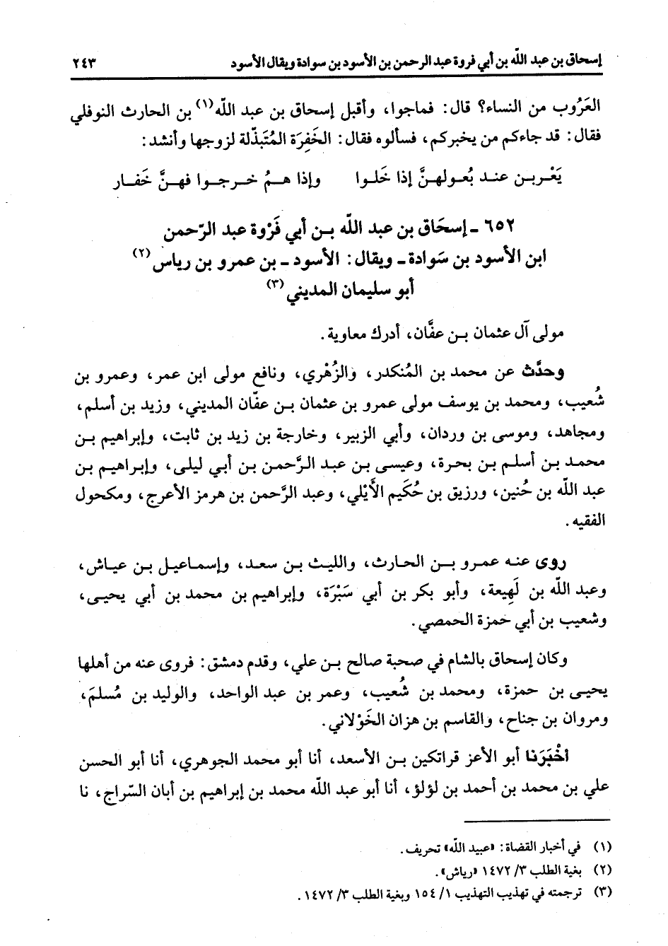 652 - إسحاق بن عبد الله بن أبي فروة عبد الرحمن ابن الأسود بن سوادة ويقال الأسود بن عمرو بن رياس (2) أبو سليمان المديني (3) مولى آل عثمان بن عفان أدرك معاوية وحدث عن محمد بن المنكدر والزهري ونافع مولى ابن عمر وعمرو بن شعيب ومحمد بن يوسف مولى عمرو بن عثمان بن عفان المديني وزيد بن أسلم ومجاهد وموسى بن وردان وأبي الزبير وخارجة بن زيد بن ثابت وإبراهيم بن محمد بن أسلم بن بحرة وعيسى بن عبد الرحمن بن أبي ليلى وإبراهيم بن عبد الله بن حنين ورزيق بن حكيم الأيلي وعبد الرحمن بن هرمز الأعرج ومكحول الفقيه روى عنه عمرو بن الحارث والليث بن سعد وإسماعيل بن عياش وعبد الله بن لهيعة وأبو بكر بن أبي سبرة وإبراهبم بن محمد بن أبي يحيى وشعيب بن أبي حمزة الحمصي وكان إسحاق بالشام في صحبة صالح بن علي وقدم دمشق فروى عنه من أهلها يحيى بن حمزة ومحمد بن شعيب وعمر بن عبد الواحد والوليد بن مسلم ومروان بن جناح والقاسم بن هزان الخولاني أخبرنا أبو الأعز قراتكين بن الأسعد أنا أبو محمد الجوهري أنا أبو الحسن علي بن محمد بن أحمد بن لؤلؤ أنا أبو عبد الله محمد بن إبراهيم بن أبان السراج نا