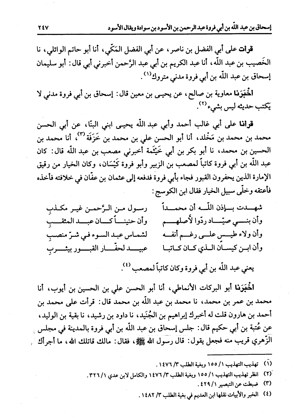 قرأت على أبي الفصل بن ناصر عن أبي الفضل المكي أنا أبو حاتم الوائلي نا الخصيب بن عبد الله أنا عبد الكريم بن أبي عبد الرحمن أخبرني أبي قال أبو سليمان إسحاق بن عبد الله بن أبي فروة مدني متروك (1) أخبرنا معاوية بن صالح عن يحيى بن معين قال إسحاق بن أبي فروة مدني لا يكتب حديثه ليس بشئ (2) قرأنا على أبي غالب أحمد وأبي عبد الله يحيى ابني البنا عن أبي الحسن محمد بن محمد بن مخلد أنا أبو الحسن علي بن محمد بن خزفة (3) أنا محمد بن الحسين بن محمد نا أبو بكر بن أبي خيثمة أخبرني مصعب بن عبد الله قال كان عبد الله بن أبي فروة كاتبا لمصعب بن الزبير وأبو فروة كيسان وكان الخيار من رقيق الإمارة الذين يحفرون القبور فجاء بأبي فروة فدفعه إلى عثمان بن عفان في خلافته فأخذه فأعتقه وخلى سبيل الخيار فقال ابن الكوسج شهدت بإذن الله أن محمدا * رسول من الرحمن غير مكذب وأن بني صياد ردوا لأصلهم * وأن حنينا كان عبد المثقب وأن ولاء طيس على رغم أنفه * لشماس عبد السوء في شر منصب وأن ابن كيسان الذي كان كاتبا * عبيد لحفار القبور بيثرب * يعني عبد الله بن أبي فروة وكان كاتبا لمصعب (4) أخبرنا أبو البركات الأنماطي أنا أبو الحسن علي بن الحسين بن أيوب أنا محمد بن عمر بن محمد نا محمد بن عبد الله بن محمد قال قرأت على محمد بن أحمد بن هارون قلت له أخبرك إبراهيم بن الجنيد نا داود بن رشيد نا بقية بن الوليد عن عتبة بن أبي حكيم قال جلس إسحاق بن عبد الله بن أبي فروة بالمدينة في مجلس الزهري قريب منه فجعل يقول قال رسول الله (صلى الله عليه وسلم) فقال مالك قاتلك الله ما أجراك