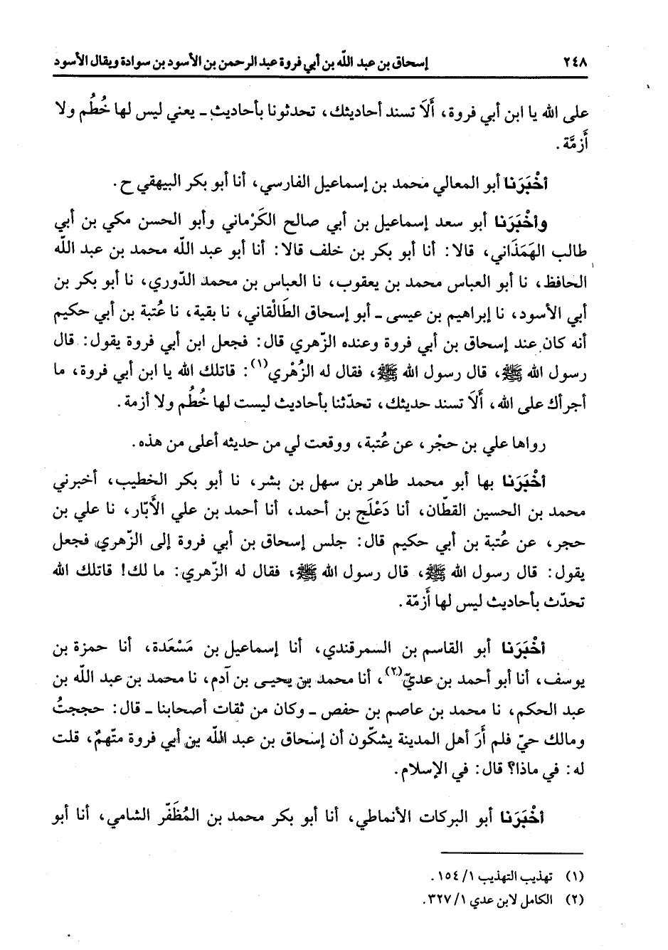 على الله يا ابن أبي فروة ألا تسند أحاديثك تحدثونا بأحاديث يعني ليس لها خطم ولا أزمة أخبرنا أبو المعالي محمد بن إسماعيل الفارسي أنا أبو بكر البيهقي وأخبرنا أبو سعد إسماعيل بن أبي صالح الكرماني وأبو الحسن مكي بن أبي طالب الهمذاني قالا أنا أبو بكر بن خلف قالا أنا أبو عبد الله محمد بن عبد الله الحافظ نا أبو العباس محمد بن يعقوب نا العباس بن محمد الدوري نا أبو بكر بن أبي الأسود نا إبراهيم بن عيسى أبو إسحاق الطالقاني نا بقية نا عتبة بن أبي حكيم أنه كان عند إسحاق بن أبي فروة وعنده الزهري قال فجعل ابن أبي فروة يقول قال رسول الله (صلى الله عليه وسلم) قال رسول الله (صلى الله عليه وسلم) فقال له الزهري (1) قاتلك الله يا ابن أبي فروة ما أجرأك على الله ألا تسند حديثك تحدثنا بأحاديث ليست لها خطم ولا أزمة رواها علي بن حجر عن عتبة ووقعت لي من حديثه أعلى من هذه أخبرنا بها أبو محمد طاهر بن سهل بن بشر نا أبو بكر الخطيب أخبرني محمد بن الحسين القطان أنا دعلج بن أحمد أنا أحمد بن علي الأبار نا علي بن حجر عن عتبة بن أبي حكيم قال جلس إسحاق بن أبي فروة إلى الزهري فجعل يقول قال رسول الله (صلى الله عليه وسلم) قال رسول الله (صلى الله عليه وسلم) فقال له الزهري ما لك قاتلك الله تحدث بأحاديث ليس لها أزمة أخبرنا أبو القاسم بن السمرقندي أنا إسماعيل بن مسعدة أنا حمزة بن يوسف أنا أبو أحمد بن عدي (2) أنا محمد بن يحيى بن آدم نا محمد بن عبد الله بن عبد الحكم نا محمد بن عاصم بن حفص وكان من ثقات أصحابنا قال حججت ومالك حي فلم أر أهل المدينة يشكون أن إسحاق بن عبد الله بن أبي فروة متهم قلت له في ماذا قال في الإسلام أخبرنا أبو البركات الأنماطي أنا أبو بكر محمد بن المظفر الشامي أنا أبو