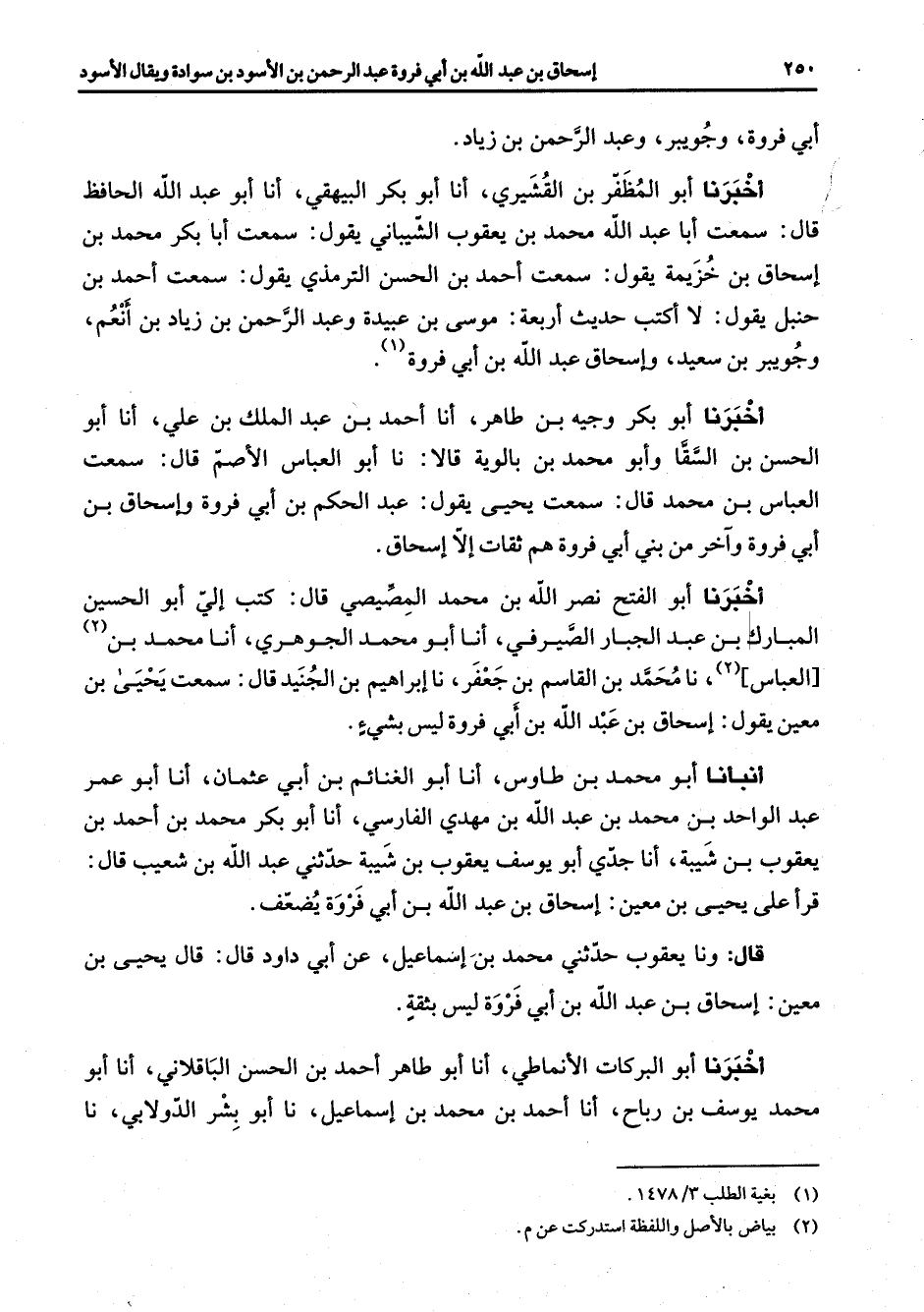 أبي فروة وجويبر وعبد الرحمن بن زياد أخبرنا أبو المظفر بن القشيري أنا أبو بكر البيهقي أنا أبو عبد الله الحافظ قال سمعت أبا عبد الله محمد بن يعقوب الشيباني يقول سمعت أبا بكر محمد بن إسحاق بن خزيمة يقول سمعت أحمد بن الحسن الترمذي يقول سمعت أحمد بن حنبل يقول لا أكتب حديث أربعة موسى بن عبيدة وعبد الرحمن بن زياد بن أنعم وجويبر بن سعيد وإسحاق عبد الله بن أبي فروة (1) أخبرنا أبو بكر وجيه بن طاهر أنا أحمد بن عبد الملك بن علي أنا أبو الحسن بن السقا وأبو محمد بن بالوية قالا نا أبو العباس الأصم قال سمعت العباس بن محمد قال سمعت يحيى يقول عبد الحكم بن أبي فروة وإسحاق بن أبي فروة وآخر من بني أبي فروة هم ثقات إلا إسحاق أخبرنا أبو الفتح نصر الله بن محمد المصيصي قال كتب إلي أبو الحسين المبارك بن عبد الجبار الصيرفي أنا أبو محمد الجوهري أنا محمد بن العباس (2) نا محمد بن القاسم بن جعفر نا إبراهيم بن الجنيد قال سمعت يحيى بن معين يقول إسحاق بن عبد الله بن أبي فروة ليس بشئ أنبأنا أبو محمد بن طاوس أنا أبو الغنائم بن أبي عثمان أنا أبو عمر عبد الواحد بن محمد بن عبد الله بن مهدي الفارسي أنا أبو بكر محمد بن أحمد بن يعقوب بن شيبة أنا جدي أبو يوسف يعقوب بن شيبة حدثني عبد الله بن شعيب قال قرأ على يحيى بن معين إسحاق بن عبد الله بن أبي فروة يضعف قال ونا يعقوب حدثني محمد بن إسماعيل عن أبي داود قال قال بن يحيى معين إسحاق بن عبد الله بن أبي فروة ليس بثقة أخبرنا أبو البركات الأنماطي أنا أبو طاهر أحمد بن الحسن الباقلاني أنا أبو محمد يوسف بن رباح أنا أحمد بن محمد بن إسماعيل نا أبو بشر الدولابي نا