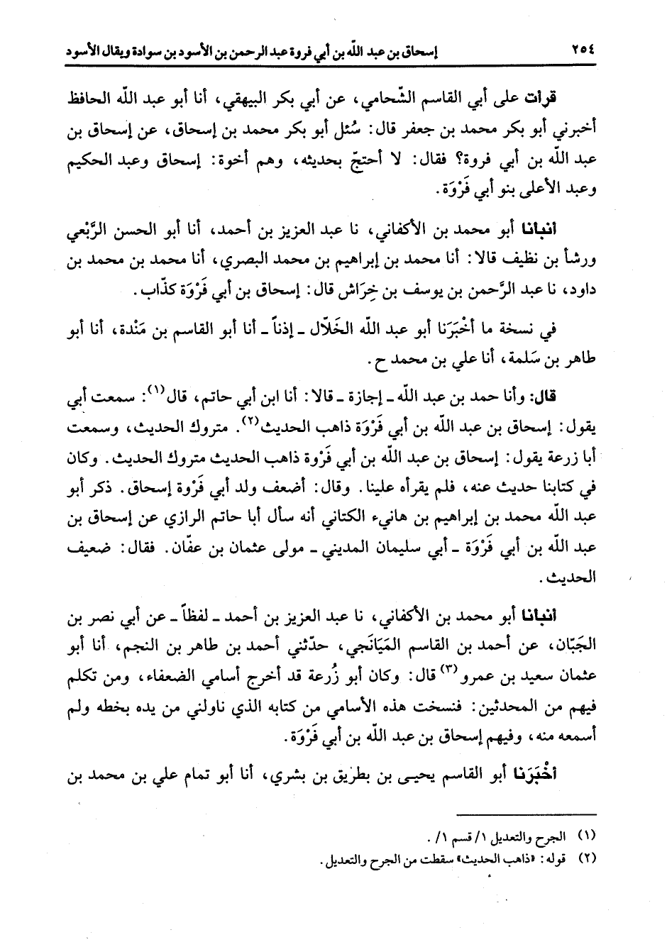 قرأت على أبي القاسم الشحامي عن أبي بكر البيهقي أنا أبو عبد الله الحافظ أخبرني أبو بكر محمد بن جعفر قال سئل أبو بكر محمد بن إسحاق عن إسحاق بن عبد الله بن أبي فروة فقال لا أحتج بحديثه وهم أخوة إسحاق وعبد الحكيم وعبد الأعلى بنو أبي فروة أنبأنا أبو محمد بن الأكفاني نا عبد العزيز بن أحمد أنا أبو الحسن الربعي ورشأ بن نظيف قالا أنا محمد بن إبراهيم بن محمد البصري أنا محمد بن محمد بن داود نا عبد الرحمن بن يوسف بن خراش قال إسحاق بن أبي فروة كذاب في نسخة ما أخبرنا أبو عبد الله الخلال إذنا أنا أبو القاسم بن مندة أنا أبو طاهر بن سلمة أنا علي بن محمد قال وأنا حمد بن عبد الله إجازة قالا أنا ابن أبي حاتم قال (1) سمعت أبي يقول إسحاق بن عبد الله بن أبي فروة ذاهب الحديث (2) متروك الحديث وسمعت أبا زرعة يقول إسحاق بن عبد الله بن أبي فروة ذاهب الحديث متروك الحديث وكان في كتابنا حديث عنه فلم يقرأه علينا وقال أضعف ولد أبي فروة إسحاق ذكر أبو عبد الله محمد بن إبراهيم بن هانئ الكتاني أنه سأل أبا حاتم الرازي عن إسحاق بن عبد الله بن أبي فروة أبي سليمان المديني مولى عثمان بن عفان فقال ضعيف الحديث أنبأنا أبو محمد بن الأكفاني نا عبد العزيز بن أحمد لفظا عن أبي نصر بن الجبان عن أحمد بن القاسم الميانجي حدثني أحمد بطاهر بن النجم أنا أبو عثمان سعيد بن عمرو (3) قال وكان أبو زرعة قد أخرج أسامي الضعفاء ومن تكلم فيهم من المحدثين فنسخت هذه الأسامي من كتابه الذي ناولني من يده بخطه ولم أسمعه منه وفيهم إسحاق بن عبد الله بن أبي فروة أخبرنا أبو القاسم يحيى بن بطريق بن بشري أنا أبو تمام علي بن محمد بن