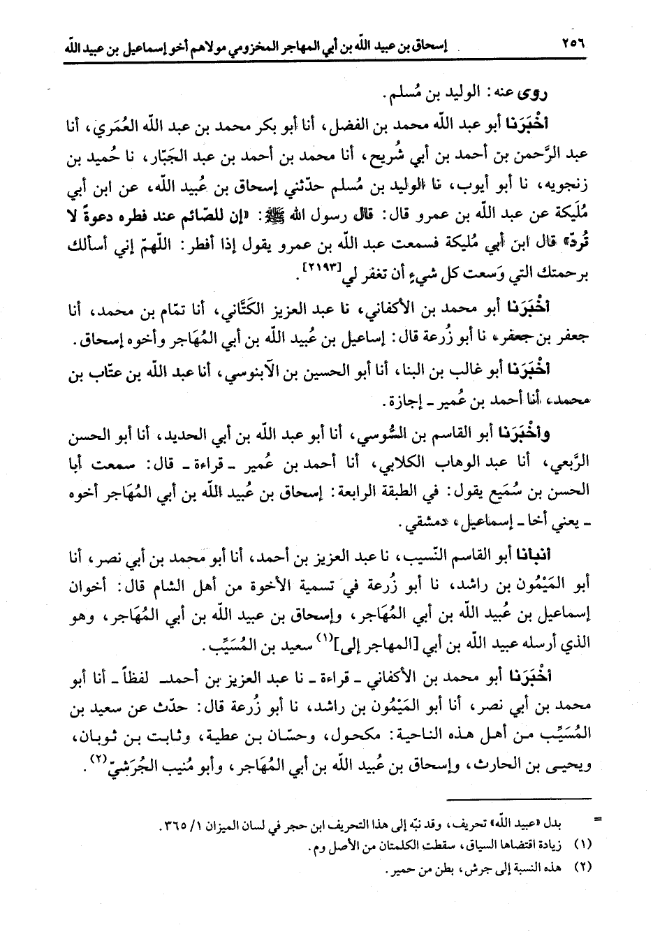 وى عنه الوليد بن مسلم أخبرنا أبو عبد الله محمد بن الفضل أنا أبو بكر محمد بن عبد الله العمري أنا عبد الرحمن بن أحمد بن أبي شريح أنا محمد بن أحمد بن عبد الجبار نا حميد بن زنجوية نا أبو أيوب نا الوليد بن مسلم حدثني إسحاق بن عبيد الله عن ابن أبي مليكة عن عبد الله بن عمرو قال قال رسول الله (صلى الله عليه وسلم) إن للصائم عند فطره دعوة لا ترد قال ابن أبي مليكة فسمعت عبد الله بن عمرو يقول إذا أفطر اللهم إني أسألك برحتمك التي وسعت كل شئ أن تغفر لي