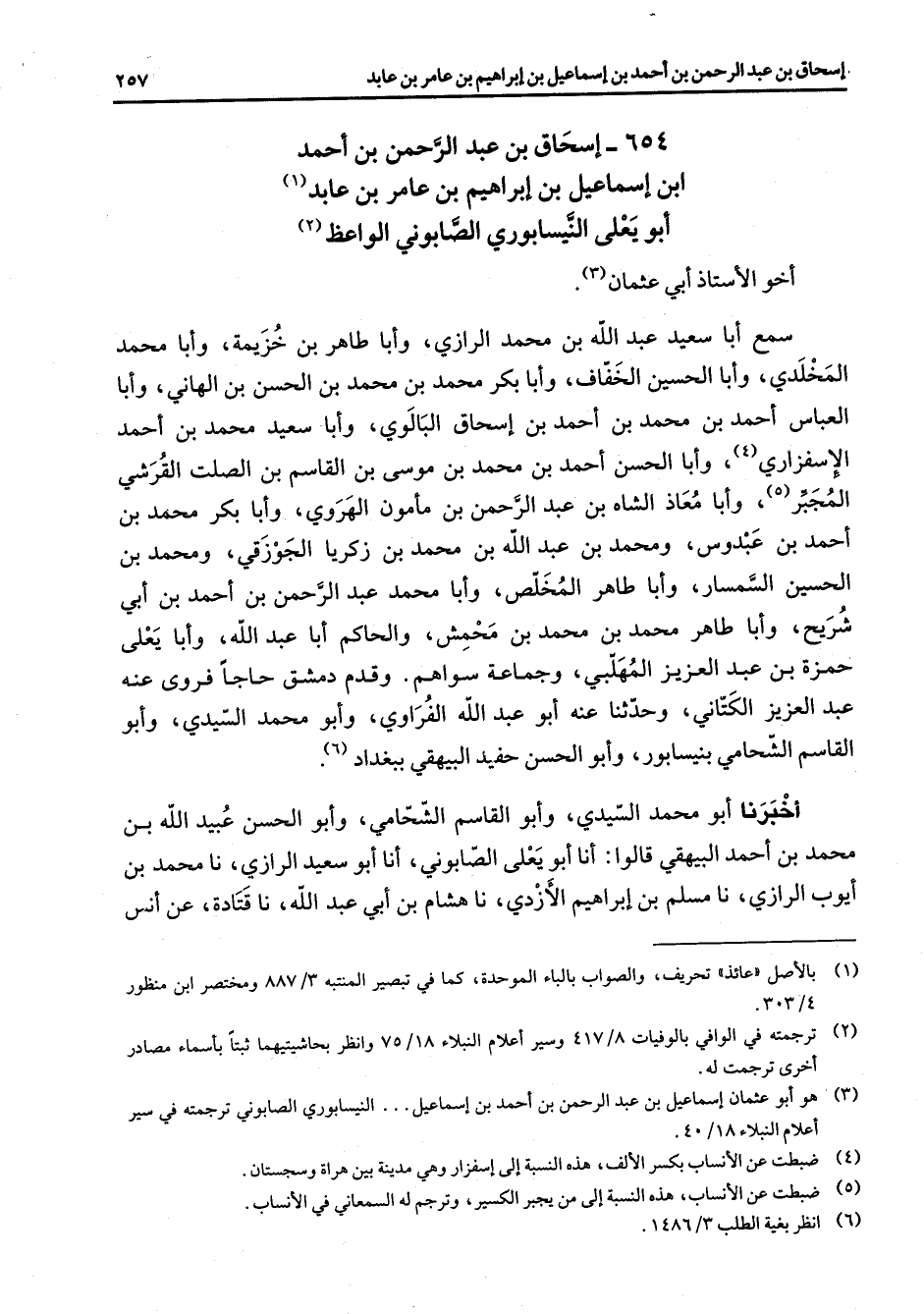 654 - إسحاق بن عبد الرحمن بن أحمد ابن إسماعيل بن إبراهيم بن عامر بن عابد (1) أبو يعلى النيسابوري الصابوني الواعظ (2) أخو الأستاذ أبي عثمان (3) سمع أبا سعيد عبد الله بن محمد الرازي وأبا طاهر بن خزيمة وأبا محمد المخلدي وأبا الحسين الخفاف وأبا بكر محمد بن محمد بن الحسن بن الهاني وأبا العباس أحمد بن محمد بن أحمد بن إسحاق البالوي وأبا سعيد محمد بن أحمد الإسفزاري (4) وأبا الحسن أحمد بن محمد بن موسى بن القاسم بن الصلت القرشي المجبر (5) وأبا معاذ الشاه بن عبد الرحمن بن مأمون الهروي وأبا بكر محمد بن أحمد بن عبدوس ومحمد بن عبد الله بن محمد بن زكريا الجوزقي ومحمد بن الحسين السمسار وأبا طاهر المخلص وأبا محمد عبد الرحمن بن أحمد بن أبي شريح وأبا طاهر محمد بن محمد بن محمش والحاكم أبا عبد الله وأبا يعلى حمزة بن عبد العزيز المهلبي وجماعة سواهم وقدم دمشق حاجا فروى عنه عبد العزيز الكتاني وحدثنا عنه أبو عبد الله الفراوي وأبو محمد السيدي وأبو القاسم الشحامي بنيسابور وأبو الحسن حفيد البيهقي ببغداد (6) أخبرنا أبو محمد السيدي وأبو القاسم الشحامي وأبو الحسن عبيد الله بن محمد بن أحمد البيهقي قالوا أنا أبو يعلى الصابوني أنا أبو سعيد الرازي نا محمد بن أيوب الرازي نا مسلم بن إبراهيم الأزدي نا هشام بن أبي عبد الله نا قتادة عن أنس