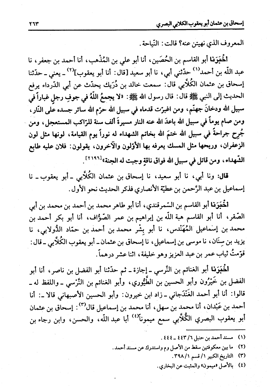 المعروف الذي نهيتن عنه قالت النياحة أخبرنا أبو القاسم بن الحصين أنا أبو علي بن المذهب أنا أحمد بن جعفر نا عبد الله بن أحمد (1) حدثني أبي نا أبو سعيد قال أنا أبو يعقوب (2) يعني حدثنا إسحاق بن عثمان الكلابي قال سمعت خالد بن دريك يحدث عن أبي الدرداء يرفع الحديث إلى النبي (صلى الله عليه وسلم) قال رسول الله (صلى الله عليه وسلم) لا يجمع الله في جوف رجل غبارا في سبيل الله ودخان جهنم ومن اغبرت قدماه في سبيل الله حرم الله سائر جسده على النار ومن صام يوما في سبيل الله باعد الله عنه النار مسيرة ألف سنة للراكب المستعجل ومن جرح جراحة في سبيل الله ختم الله بخاتم الشهداء له نورا يوم القيامة لونها مثل لون الزعفران وريحها مثل المسك يعرفه بها الأولون والآخرون يقولون فلان عليه طابع الشهداء ومن قاتل في سبيل الله فواق ناقة وجبت له الجنة
