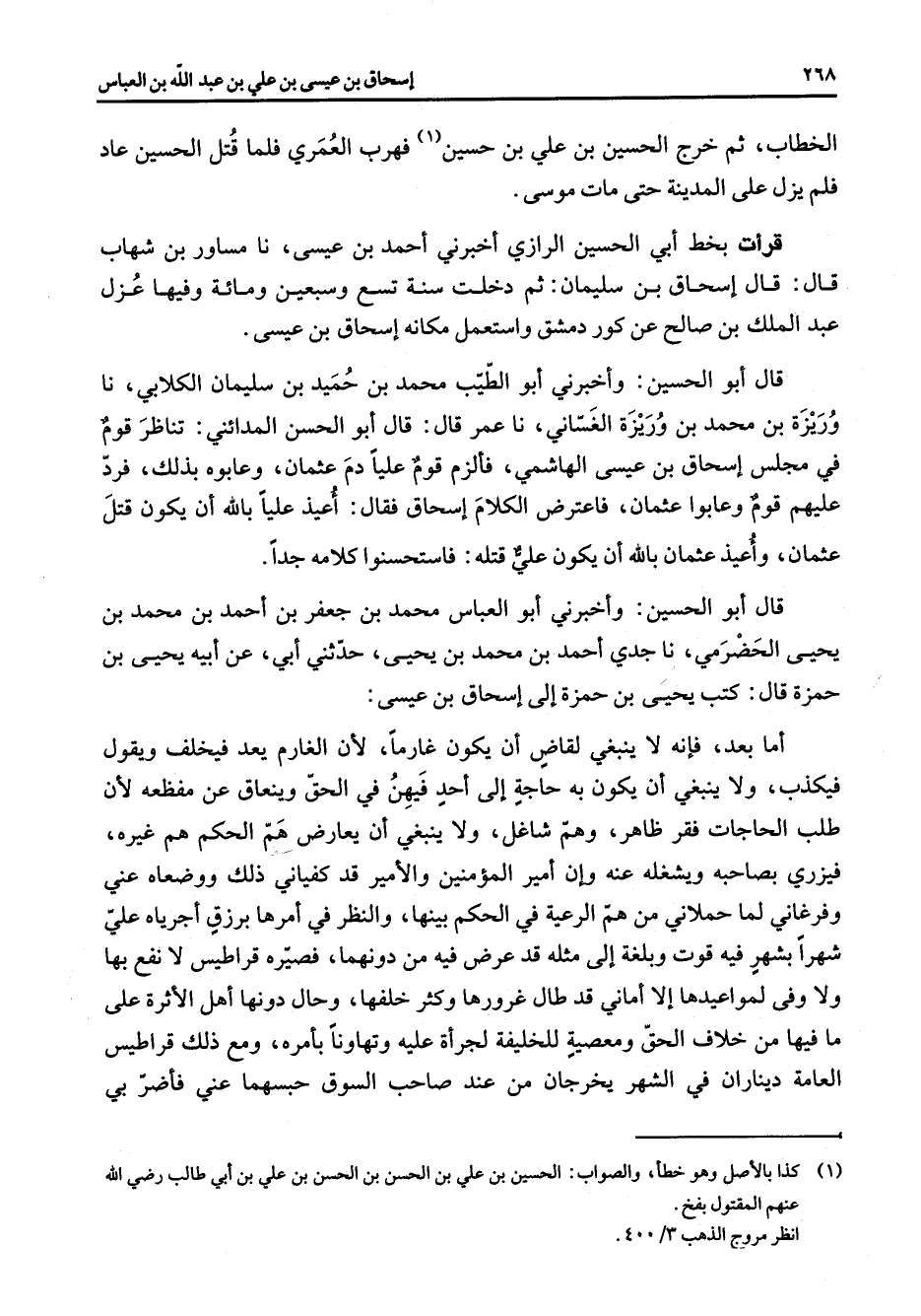 الخطاب ثم خرج الحسين بن علي بن حسين (1) فهرب العمري فلما قتل الحسين عاد فلم يزل على المدينة حتى مات موسى قرأت بخط أبي الحسين الرازي أخبرني أحمد بن عيسى نا مساور بن شهاب قال قال إسحاق بن سليمان ثم دخلت سنة تسع وسبعين ومائة وفيها عزل عبد الملك بن صالح عن كور دمشق واستعمل مكانه إسحاق بن عيسى قال أبو الحسين وأخبرني أبو الطيب محمد بن حميد بن سليمان الكلابي نا وريزة بن محمد بن وريزة الغساني نا عمر قال قال أبو الحسن المدائني تناظر قوم في مجلس إسحاق بن عيسى الهاشمي فألزم قوم عليا دم عثمان وعابوه بذلك فرد عليهم قوم وعابوا عثمان فاعترض الكلام إسحاق فقال أعيذ عليا بالله أن يكون قتل عثمان وأعيذ عثمان بالله أن يكون علي قتله فاستحسنوا كلامه جدا قال أبو الحسين وأخبرني أبو العباس محمد بن جعفر بن أحمد بن محمد بن يحيى الحضرمي نا جدي أحمد بن محمد بن يحيى حدثني أبي عن أبيه يحيى بن حمزة قال كتب يحيى بن حمزة إلى إسحاق بن عيسى أما بعد فإنه لا ينبغي لقاض أن يكون غارما لأن الغارم يعد فيخلف ويقول فيكذب ولا ينبغي أن يكون به حاجة إلى أحد فيهن في الحق وينعاق عن مفظعه لأن طلب الحاجات فقر ظاهر وهم شاغل ولا ينبغي أن يعارض هم الحكم هم غيره فيزري بصاحبه ويشغله عنه وإن أمير المؤمنين والأمير قد كفياني ذلك ووضعاه عني وفرغاني لما حملاني من هم الرعية في الحكم بينهما والنظر في أمرها برزق أجرياه علي شهرا بشهر فيه قوت وبلغة إلى مثله قد عرض فيه من دونهما فصيره قراطيس لا نفع بها ولا في لمواعيدها إلا أماني قد طال غرورها وكثر خلفها وحال دونها أهل الأثرة على ما فيها من خلاف الحق ومعصية للخليفة لجرأة عليه وتهاونا بأمره ومع ذلك قراطيس العامة ديناران في الشهر يخرجان من عند صاحب السوق حبسهما عني فأضر بي