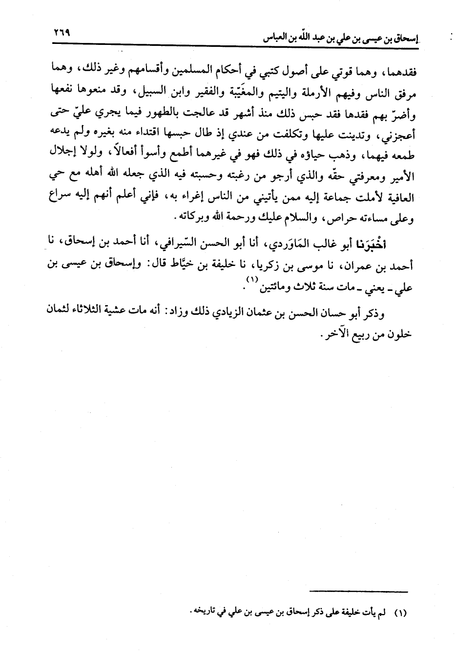 فقدهما وهما قوتي على أصول كتبي في أحكام المسلمين وأقسامهم وغير ذلك وهما مرفق الناس وفيهم الأرملة واليتيم والمغيبة والفقير وابن السبيل وقد منعوها نفعها واضر بهم فقدها فقد حبس ذلك منذ أشهر قد عالجت بالطهور فيما يجري علي حتى أعجزني وتدينت عليها وتكلفت من عندي إذ طال حبسها اقتداء منه بغيره ولم يدعه طمعه فيهما وذهب حياؤه في ذلك فهو في غيرهما أطمع وأسوأ أفعالا ولولا إجلال الأمير ومعرفتي حقه والذي أرجو من رغبته وحسبته فيه الذي جعله الله أهله من حي العافية لأملت جماعة إليه ممن يأتيني من الناس إغراء به فإني أعلم أنهم إليه سراع وعلى مساءته حراص والسلام عليك ورحمة الله وبركاته أخبرنا أبو غالب الماوردي أنا أبو الحسن السيرافي أنا أحمد بن إسحاق نا أحمد بن عمران نا موسى بن زكريا نا خليفة بن خياط قال وإسحاق بن عيسى بن علي يعني مات سنة ثلاث ومائتين (1) وذكر أبو حسان الحسن بن عثمان الزيادي ذلك وزاد أنه مات عشية الثلاثاء لثمان خلون من ربيع الآخر