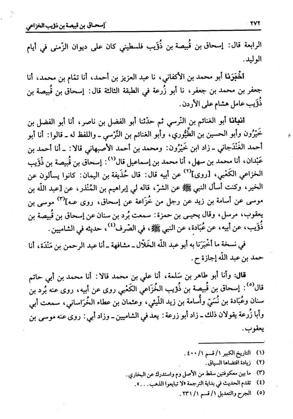 الرابعة قال إسحاق بن قبيصة بن ذؤيب فلسطيني كان على ديوان الزمنى في أيام الوليد أخبرنا أبو محمد بن الأكفاني نا عبد العزيز بن أحمد أنا تمام بن محمد أنا جعفر بن محمد بن جعفر نا أبو زرعة في الطبقة الثالثة قال إسحاق بن قبيصة بن ذؤيب عامل هشام على الأردن أنبأنا أبو الغنائم بن النرسي ثم حدثنا أبو الفضل بن ناصر أنا أبو الفضل بن خيرون وأبو الحسين بن الطيوري وأبو الغنائم بن النرسي واللفظ له قالوا أنا أبو أحمد الغندجاني زاد ابن خيرون ومحمد بن أحمد الأصبهاني قالا أنا أحمد بن عبدان أنا محمد بن سهل أنا محمد بن إسماعيل قال (1) إسحاق بن قبيصة بن ذؤيب الخزاعي الكعبي روى (2) عن أبيه قال قال حذيفة بن اليمان كانوا يسألون عن الخير وكنت أسأل النبي (صلى الله عليه وسلم) عن الشر قاله لي إبراهيم بن المنذر عن عبد الله بن موسى عن أسامة بن زيد عن رجل من خزاعة عن إسحاق روى عنه (3) موسى بن يعقوب مرسل وقال يحيى بن حمزة سمعت برد بن سنان عن إسحاق بن قبيصة بن ذؤيب عن أبيه عن عبادة عن النبي (صلى الله عليه وسلم) في الصرف (4) حديثه في الشاميين في نسخة ما أخبرنا به أبو عبد الله الخلال مشافهة أنا عبد الرحمن بن مندة أنا حمد بن عبد الله إجازة [ح] قال وأنا أبو طاهر بن سلمة أنا علي بن محمد قالا أنا محمد بن أبي حاتم قال (5) إسحاق بن قبيصة بن ذؤيب الخزاعي الكعبي روى عن أبيه روى عنه برد بن سنان وعبادة بن نسي وأسامة بن زيد الليثي وعثمان بن عطاء الخراساني سمعت أبي وأبا زرعة يقولان ذلك زاد أبو زرعة يعد في الشاميين وزاد أبي روى عنه موسى بن يعقوب