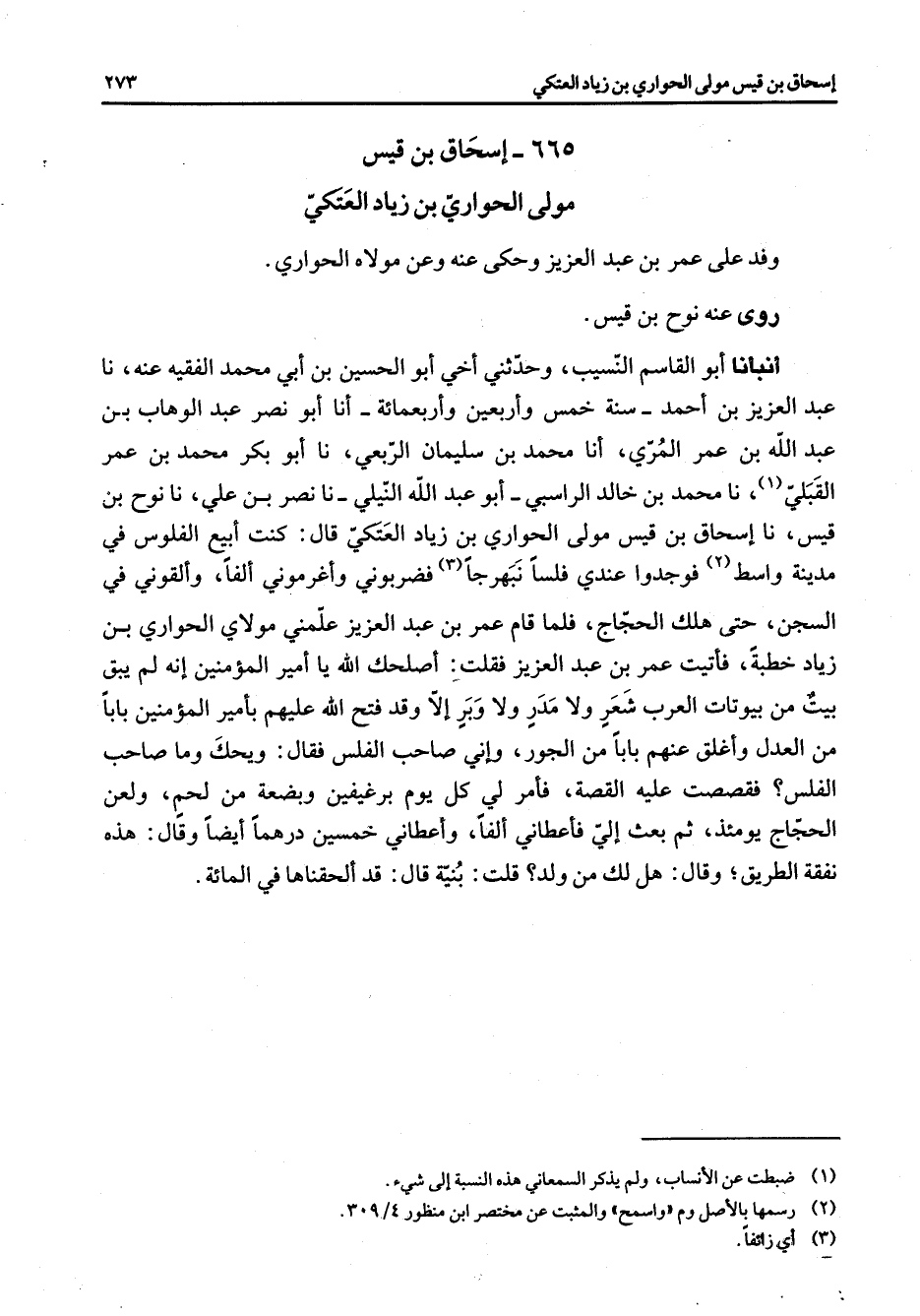 665 - إسحاق بن قيس مولى الحواري بن زياد العتكي وفد على عمر بن عبد العزيز وحكى عنه وعن مولاه الحواري روى عنه نوح بن قيس أنبأنا أبو القاسم النسيب وحدثني أخي أبو الحسين بن أبي محمد الفقيه عنه نا عبد العزيز بن أحمد سنة خمس وأربعين وأربعمائة أنا أبو نصر عبد الوهاب بن عبد الله بن عمر المري أنا محمد بن سليمان الربعي نا أبو بكر محمد بن عمر القبلي (1) نا محمد بن خالد الراسبي أبو عبد الله النيلي نا نصر بن علي نا نوح بن قيس نا إسحاق بن قيس مولى الحواري بن زياد العتكي قال كنت أبيع الفلوس في مدينة واسط (2) فوجدوا عندي فلسا نبهرجا (3) فضربوني وأغرموني ألفا وألقوني في السجن حتى هلك الحجاج فلما قام عمر بن عبد العزيز علمني مولاي الحواري بن زياد خطبة فأتيت عمر بن عبد العزيز فقلت أصلحك الله يا أمير المؤمنين إنه لم يبق بيت من بيوتات العرب شعر ولا مدر ولا وبر إلا وقد فتح الله عليهم بأمير المؤمنين بابا من العدل وأغلق عنهم بابا من الجور وإني صاحب الفلس فقال ويحك وما صاحب الفلس فقصصت عليه القصة فأمر لي كل يوم برغيفين وبضعة من لحم ولعن الحجاج يومئذ ثم بعث إلي فأعطاني ألفا وأعطاني خمسين درهما أيضا وقال هذه نفقة الطريق وقال هل لك من ولد قلت بنية قال قد ألحقناها في المائة