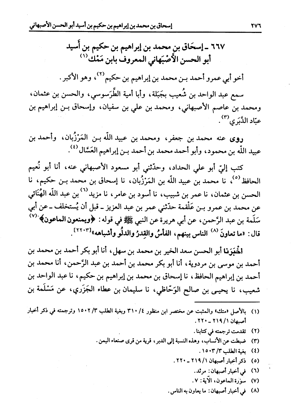 667 - إسحاق بن محمد بن إبراهيم بن حكيم بن أسيد أبو الحسن الأصبهاني المعروف بابن ممك (1) أخو أبي عمرو أحمد بن محمد بن إبراهيم بن حكيم (2) وهو الأكبر سمع عبد الواحد بن شعيب بجبلة وأبا أمية الطرسوسي والحسن بن عثمان ومحمد بن عاصم الأصبهاني ومحمد بن علي بن سفيان وإسحاق بن إبراهيم بن عباد الدبري (3) روى عنه محمد بن جعفر ومحمد بن عبيد الله بن المرزبان وأحمد بن عبيد الله بن محمود وأبو أحمد محمد بن أحمد بن إبراهيم العسال (4) كتب إلي أبو علي الحداد وحدثني أبو مسعود الأصبهاني عنه أنا أبو نعيم الحافظ (5) نا محمد بن عبيد الله بن المرزبان نا إسحاق بن محمد بن حكيم نا الحسن بن عثمان نا عمر بن شبيب نا أسود بن عامر نا مزيد بن عبد الله الهنائي عن محمد بن عمرو بن علقمة حدثني عمر بن عبد العزيز قبل أن يستخلف عن أبي سلمة بن عبد الرحمن عن أبي هريرة عن النبي (صلى الله عليه وسلم) في قوله " ويمنعون الماعون " قال ما تعاون (8) الناس بينهم الفأس والقدر والدلو وأشباهه