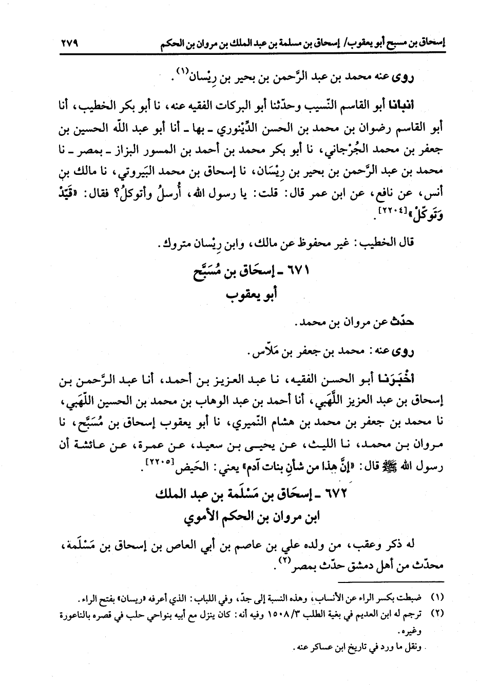 روى عنه محمد بن عبد الرحمن بن بحير بن ريسان (1) أنبأنا أبو القاسم النسيب وحدثنا أبو البركات الفقيه عنه نا أبو بكر الخطيب أنا أبو القاسم رضوان بن محمد بن الحسن الدينوري بها أنا أبو عبد الله الحسين بن جعفر بن محمد الجرجاني نا أبو بكر محمد بن أحمد بن المسور البزاز بمصر نا محمد بن عبد الرحمن بن بحير بن ريسان نا إسحاق بن محمد البيروتي نا مالك بن أنس عن نافع عن ابن عمر قال قلت يا رسول الله أرسل وأتوكل فقال قيد وتوكل [2204 *] قال الخطيب غير محفوظ عن مالك وابن ريسان متروك 671 إسحاق بن مسبح أبى يعقوب حدث عن مروان بن محمد روى عنه محمد بن جعفر بن ملاس أخبرنا أبو الحسن الفقيه نا عبد العزيز بن أحمد أنا عبد الرحمن بن إسحاق بن عبد العزيز اللهبي أنا أحمد بن عبد الوهاب بن محمد بن الحسين اللهبي نا محمد بن جعفر بن محمد بن هشام النميري نا أبو يعقوب إسحاق بن مسبح نا مروان بن محمد نا الليث عن يحيى بن سعيد عن عمرة عن عائشة أن رسول الله (صلى الله عليه وسلم) قال إن هذا من شأن بنات آدم