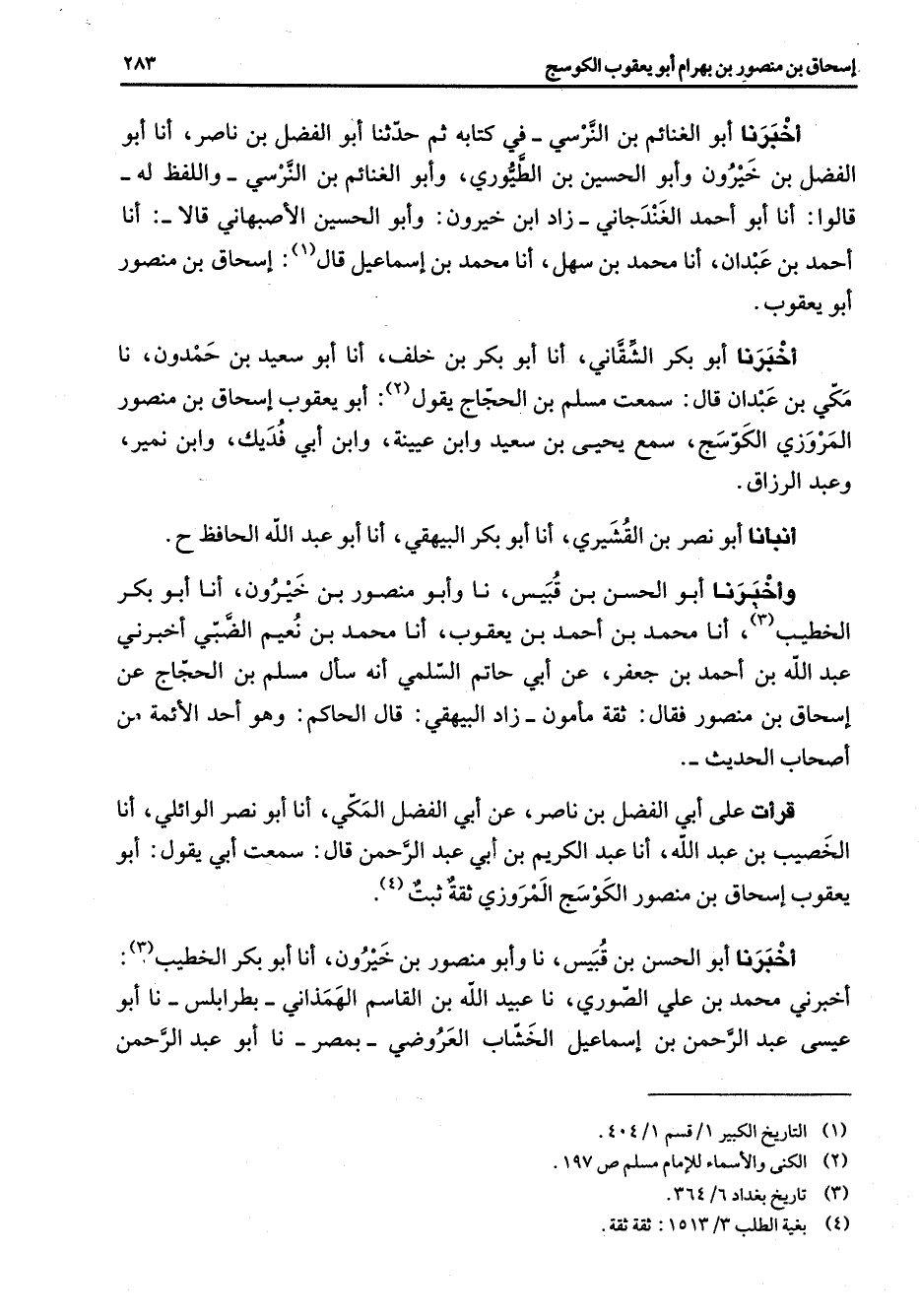 أخبرنا أبو الغنائم بن النرسي في كتابه ثم حدثنا أبو الفضل بن ناصر أنا أبو الفضل بن خيرون وأبو الحسين بن الطيوري وأبو الغنائم بن النرسي واللفظ له قالوا أنا أبو أحمد الغندجاني زاد ابن خيرون وأبو الحسين الأصبهاني قالا أنا أحمد بن عبدان أنا محمد بن سهل أنا محمد بن إسماعيل قال إسحاق بن منصور أبو يعقوب أخبرنا أبو بكر الشقاني أنا أبو بكر بن خلف أنا أبو سعيد بن حمدون نا مكي بن عبدان قال سمعت مسلم بن الحجاج يقول أبو يعقوب إسحاق بن منصور المروزي الكوسج سمع يحيى بن سعيد وابن عيينة وابن أبي فديك وابن نمير وعبد الرزاق أنبأنا أبو نصر بن القشيري أنا أبو بكر البيهقي أنا أبو عبد الله الحافظ [ح] وأخبرنا أبو الحسن بن قبيس نا وأبو منصور بن خيرون أنا أبو بكر الخطيب (3) أنا محمد بن أحمد بن يعقوب أنا محمد بن نعيم الضبي أخبرني عبد الله بن أحمد بن جعفر عن أبي حاتم السلمي أنه سأل مسلم بن الحجاج عن إسحاق بن منصور فقال ثقة مأمون زاد البيهقي قال الحاكم وهو أحد الأئمة من أصحاب الحديث قرأت على أبي الفضل بن ناصر عن أبي الفضل المكي أنا أبو نصر الوائلي أنا الخصيب بن عبد الله أنا عبد الكريم بن أبي عبد الرحمن قال سمعت أبي يقول أبو يعقوب إسحاق بن منصور الكوسج المروزي ثقة ثبت (4) أخبرنا أبو الحسن بن قبيس نا أبو منصور بن خيرون أنا أبو بكر الخطيب (3) أخبرني محمد بن علي الصوري نا عبيد الله بن القاسم الهمذاني بطرابلس نا أبو عيسى عبد الرحمن بن إسماعيل الخشاب العروضي بمصر نا أبو عبد الرحمن