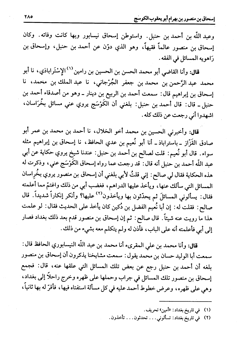 وعبد الله بن أحمد بن حنبل واستوطن إسحاق نيسابور وبها كانت وفاته وكان إسحاق بن منصور عالما فقيها وهو الذي دون عن أحمد بن حنبل وإسحاق بن راهويه المسائل في الفقه قال وأنا القاضي أبو محمد الحسن بن الحسين بن رامين (1) الاستراباذي نا أبو محمد عبد الرحمن بن محمد بن جعفر الجرجاني نا عبيد الملك بن محمد نا إسحاق بن إبراهيم قال سمعت أحمد بن الربيع بن دينار وهو من أصدقاء أحمد بن حنبل قال قال أحمد بن حنبل بلغني أن الكوسج يروي عني مسائل بخراسان اشهدوا أني رجعت عن ذلك كله قال وأخبرني الحسين بن محمد أخو الخلال نا أحمد بن محمد بن عمر أبو صادق القزاز باستراباذ أنا أبو نعيم بن عدي الحافظ نا إسحاق بن إبراهيم مثله سواء قال أبو نعيم قلت لصالح بن أحمد بن حنبل عندنا شيخ يروي عن حكاية عن أبي عبد الله أحمد بن حنبل أنه قال قد رجعت عما رواه إسحاق الكوسج عني وذكرت له هذه الحكاية فقال لي صالح إني قلت لأبي بلغني أن إسحاق بن منصور يروي بخراسان المسائل التي سألك عنها ويأخذ عليها الدراهم فغضب أبي من ذلك واغتم مما أعلمته فقال يسألوني المسائل ثم يحدثون بها ويأخذون (2) عليها وأنكر إنكارا شديدا قال صالح فقلت له إن أبا نعيم الفضل بن دكين كان يأخذ على الحديث فقال لو علمت هذا ما رويت عنه شيئا قال صالح ثم إن إسحاق بن منصور قدم بعد ذلك بغداد فصار إلى أبي فأعلمته أنه على الباب فأذن له ولم يتكلم معه بشئ من ذلك قال وأنا محمد بن علي المقرئ أنا محمد بن عبد الله النيسابوري الحافط قال سمعت أبا الوليد حسان بن محمد يقول سمعت مشايخنا يذكرون أن إسحاق بن منصور بلغه أن أحمد بن حنبل رجع عن بعض تلك المسائل التي علقها عنه قال فجمع إسحاق بن منصور تلك المسائل في جراب وحملها على ظهره وخرج راحلا إلى بغداد وهي على ظهره وعرض خطوط أحمد عليه في كل مسألة استفتاه فيها فأقر له بها ثانيا