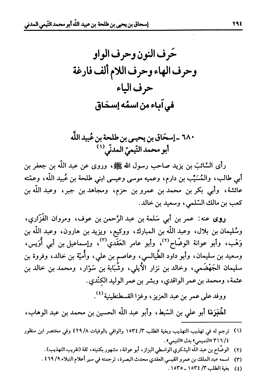 " حرف النون وحرف الواو وحرف الهاء وحرف اللام ألف فارغة " " حرف الياء في آباء من اسمه إسحاق " 680 إسحاق بن يحيى بن طلحة بن عبد الله محمد التيمي المدني (1) رأى السائب بن يزيد صاحب رسول الله (صلى الله عليه وسلم) وروى عن عبد الله بن جعفر بن أبي طالب والمسيب بن دارم وعميه موسى وعيسى ابني طلحة بن عبيد الله وعمته عائشة وأبي بكر بن محمد بن عمرو بن حزم ومجاهد بن جبر وعبد الله بن كعب بن مالك السلمي وسعيد بن خالد روى عنه عمبن أبي سلمة بن عبد الرحمن بن عوف ومروان الفزاري وسليمان بن بلال وعبد الله بن المبارك ووكيع ويزيد بن هارون وعبد الله بن وهب وأبو عوانة الوضاح (2) وأبو عامر العقدي (3) وإسماعيل بن أبي أويس وسعيد بن سليمان وأبو داود الطيالسي وعاصم بن علي وأمية بن خالد وفروة بن سليمان الجهضمي وخالد بن نزار الأيلي وشبابة بن سوار ومحمد بن خالد بن عثمة ومحمد بن عمر الواقدي وبشر بن عمر الوليد الكندي ووفد على عمر بن عبد العزيز وغزا القسطنطينية (4) أخبرنا أبو علي بن السبط وأبو عبد الله الحسين بن محمد بن عبد الوهاب