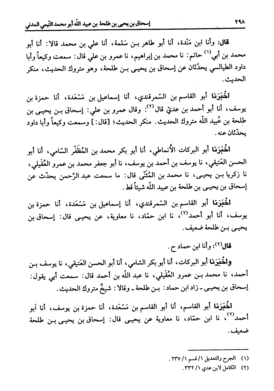 قال وأنا ابن مندة أنا أبو طاهر بن سلمة أنا علي بن محمد قالا أنا أبو محمد بن أبي (1) حاتم نا محمد بن إبراهيم نا عمرو بن علي قال سمعت وكيعا وأبا داود الطيالسي يحدثان عن إسحاق بن يحيى بن طلحة وهو متروك الحديث منكر الحديث أخبرنا أبو القاسم بن السمرقندي أنا إسماعيل بن مسعدة أنا حمزة بن يوسف أنا أبو أحمد بن عدي قال (2) وقال عمرو بن علي إسحاق بن يحيى بن طلحة بن عبيد الله متروك الحديث منكر الحديث قال وسمعت وكيعا وأبا داود يحدثان عنه أخبرنا أبو البركات الأنماطي أنا أبو بكر محمد بن المظفر السامي أنا أبو الحسن العتيقي نا يوسف بن أحمد بن يوسف نا أبو جعفر محمد بن عمرو العقيلي نا زكريا بن يحيى نا محمد بن المثنى قال ما سمعت عبد الرحمن يحدث عن إسحاق بن يحيى بن طلحة بن عبيد الله شيئا قط أخبرنا أبو القاسم بن السمرقندي أنا إسماعيل بن مسعدة أنا حمزة بن يوسف أنا أبو أحمد (2) نا ابن حماد نا معاوية عن يحيى قال إسحاق بن يحيى بن طلحة ضعيف قال (2) وأنا ابن حماد وأخبرنا أبو البركات أنا أبو بكر الشامي أنا أبو الحسن العتيقي نا يوسف بن أحمد نا محمد بن عمرو العقيلي نا عبد الله بن أحمد قال سمعت أبي يقول إسحاق بن يحيى زاد ابن حماد بن طلحة وقالا شيخ متروك الحديث أخبرنا أبو القاسم أنا أبو القاسم بن مسعدة أنا حمزة بن يوسف أنا أبو أحمد (2) نا ابن حماد نا معاوية عن يحيى قال إسحاق بن يحيى بن طلحة ضعيف