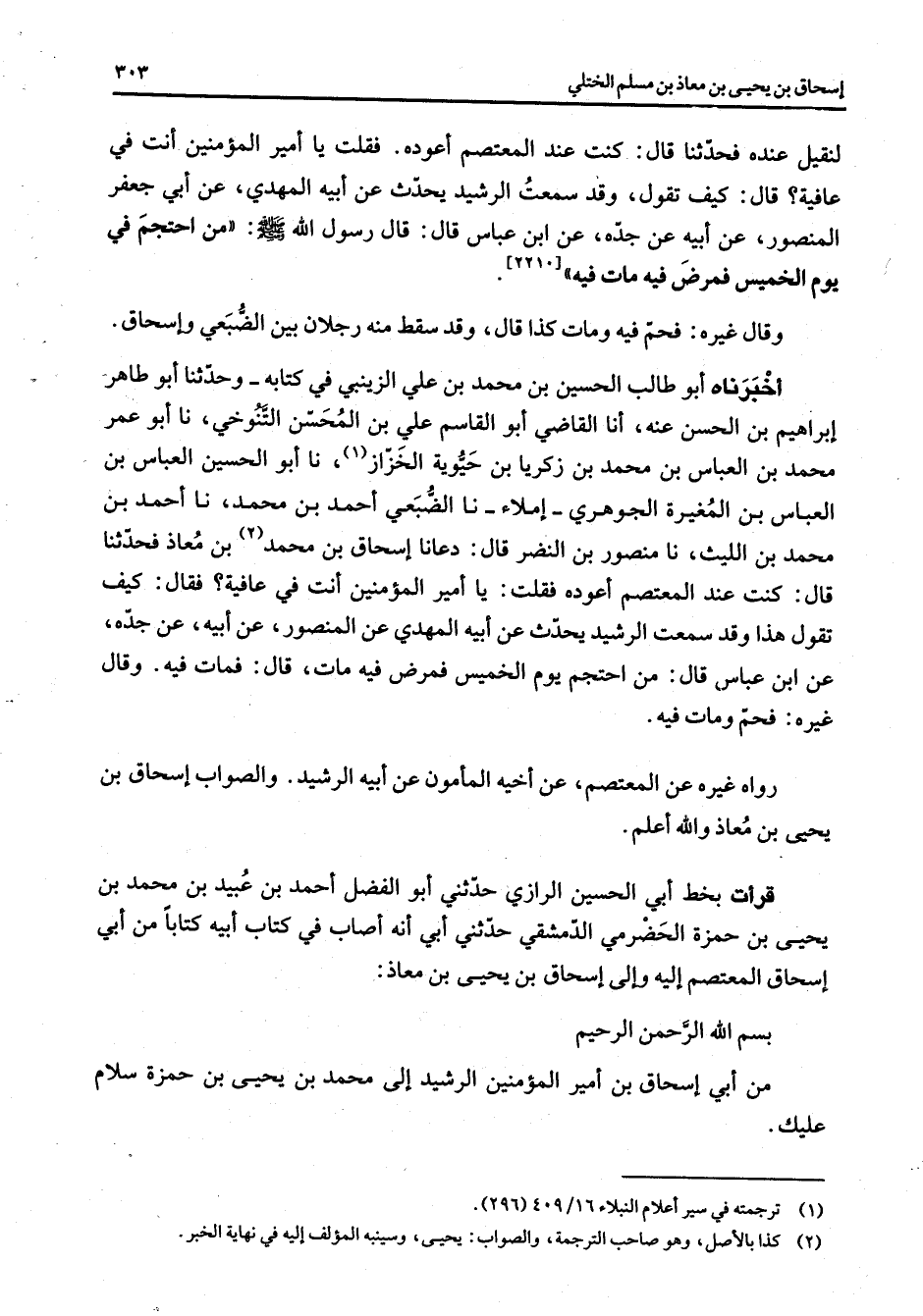 [2210] وقال غيره فحم فيه ومات كذا قال وقد سقطه منه رجلان بين الضبعي وإسحاق أخبرناه أبو طالب الحسين بن محمد بن علي الزينبي في كتابه وحدثنا أبو طاهر إبراهيم بن الحسن عنه أنا القاضي أبو القاسم علي بن المحسن التنوخي نا أبو عمر محمد بن العباس بن محمد بن زكريا بن حيوية الخزاز (1) نا أبو الحسين العباس بن العباس بن المغيرة الجوهري إملاء نا الضبعي أحمد بن محمد نا أحمد بن محمد بن الليث نا منصور بن النضر قال دعانا إسحاق بن محمد بن معاذ فحدثنا قال كنت عند المعتصم أعوده فقلت يا أمير المؤمنين أنت في عافية فقال كيف تقول هذا وقد سمعت الرشيد يحدث عن أبيه المهدي عن المنصور عن أبيه عن جده عن ابن عباس قال من احتجم يوم الخميس فمرض فيه مات قال فمات فيه وقال غيره فحم ومات فيه رواه غيره عن المعتصم عن أخيه المأمون عن أبيه الرشيد والصواب إسحاق بن يحيى بن معاذ والله أعلم قرأت بخط أبي الحسين الرازي حدثني أبو الفضل أحمد بن عبيد بن محمد بن يحيى بن حمزة الحضرمي الدمشقي حدثني أبي أنه أصاب في كتاب أبيه كتابا من أبي إسحاق المعتصم إليه وإلى إسحاق بن يحيى بن معاذ بسم الله الرحمن الرحيم من أبي إسحاق بن أمير المؤمنين الرشيد إلى محمد بن يحيى بن حمزة سلام عليك