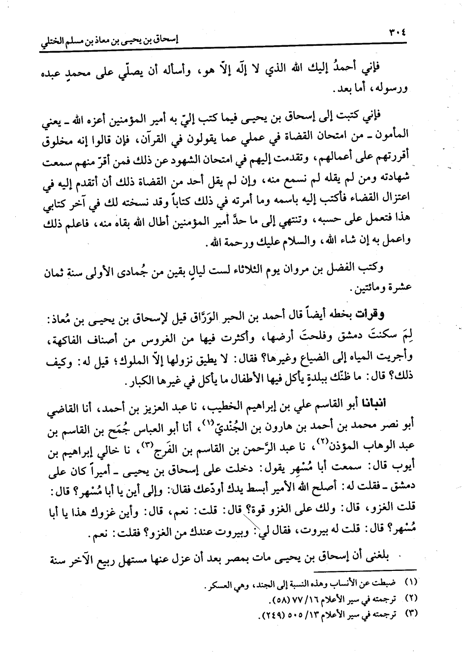 فإني أحمد إليك الله الذي لا إله إلا هو وأسأله أن يصلي على محمد عبده ورسوله أما بعد فإني كتبت إلى إسحاق بن يحيى فيما كتب إلي به أمير المؤمنين أعزه الله يعني المأمون من امتحان القضاة في عملي عما يقولون في القرآن فإن قالوا إنه مخلوق أقررتهم على أعمالهم وتقدمت إليهم في امتحان الشهود عن ذلك فمن أقر منهم سمعت شهادته ومن لم يقله لم نسمع منه وإن لم يقل أحد من القضاة ذلك أن أتقدم إليه في اعتزال القضاء فاكتب إليه باسمه وما أمرته في ذلك كتابا وقد نسخته لك في آخر كتابي هذا فتعمل على حسبه وتنتهي إلى ما حد أمير المؤمنين أطال الله بقاه منه فأعلم ذلك وأعمل به إن شاء الله والسلام عليك ورحمة الله وكتب الفضل بن مروان يوم الثلاثاء لست ليال بقين من جمادى الأولى سنة ثمان عشرة ومائتين وقرأت بخطه أيضا قال أحمد بن الحبر الوراق قيل لإسحاق بن يحيى بن معاذ لما سكنت دمشق وفلحت أرضها وأكثرت فيها من الغروس من أصناف الفاكهة وأجريت المياه إلى الضياع وغيرها فقال لا يطيق نزولها إلا الملوك قيل له وكيف ذلك قال ما ظنك ببلدة يأكل فيها الأطفال ما يأكل في غيرها الكبار أنبأنا أبو القاسم علي بن إبراهيم الخطيب نا عبد العزيز بن أحمد أنا القاضي أبو نصر محمد بن أحمد بن هارون بن الجندي (1) أنا أبو العباس جمح بن القاسم بن عبد الوهاب المؤذن (2) نا عبد الرحمن بن القاسم بن الفرج (3) نا خالي إبراهيم بن أيوب قال سمعت أبا مسهر يقول دخلت على إسحاق بن يحيى أميرا كان على دمشق فقلت له أصلح الله الأمير أبسط يدك أودعك فقال وإلى أين يا أبا مسهر قال قلت الغزو قال ولك على الغزو قوة قال قلت نعم قال وأين غزوك هذا يا أبا مسهر قال قلت له بيروت فقال لي وبيروت عندك من الغزو فقلت نعم بلغني أن إسحاق بن يحيى مات بمصر بعد أن عزل عنها مستهل ربيع الآخر سنة