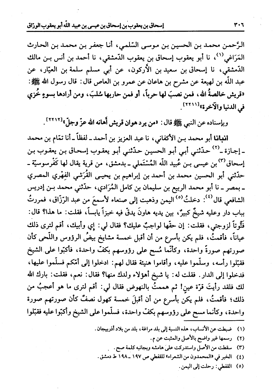 [2212] أنبأنا أبو محمد بن الأكفاني نا عبد العزيز بن أحمد لفظا أنا تمام بن محمد إجازة (2) حدثني أبي أبو الحسين حدثني أبو يعقوب إسحاق بن يعقوب بن إسحاق (3) بن عيسى بن عبيد الله المستملي بدمشق من قرية يقال لها كفرسوسية حدثني أبو الحسين محمد بن أحمد بن إبراهيم بن يحيى القرشى الفهري المصري بمصر نا أبو محمد الربيع بن سليمان بن كامل المرادي حدثني محمد بن إدريس الشافعي قال (4) دخلت (5) اليمن وذهبت إلى صنعاء لأسمع من عبد الرزاق فمررت بباب دار وعليه شيخ كبير بين يديه هاون يدق فيه خبزا يابسا فقلت ما هذا قال فتوتا لزوجتي فقلت إن حقها لواجب عليك فقال لي أي وأبيك أقم لترى ذلك عيانا فأقمت فلم يكن بأسرع من أن أقبل خمسة مشايخ بيض الرؤوس واللحى كأن صورتهم صورة واحدة وكأنما مسح على رؤوسهم بكف واحدة فأكبوا على الشيخ فقبلوا رأسه وسلموا عليه وأقاموا هنيئة فقال لهم ادخلوا إلى أمكم فسلموا عليها فدخلوا إلى الدار فقلت له يا شيخ أهؤلاء ولدك منها فقال نعم فقلت بارك الله لك فلقد رأيت قرة عين ثم هممت بالنهوض فقال لي أقم لترى ما هو أعجب من ذلك فأقمت فلم يكن بأسرع من أن أقبل خمسة كهول نصف كأن صورتهم صورة واحدة وكأنما مسح على رؤوسهم بكف واحدة فسلموا على الشيخ وأكبوا عليه فقبلوا