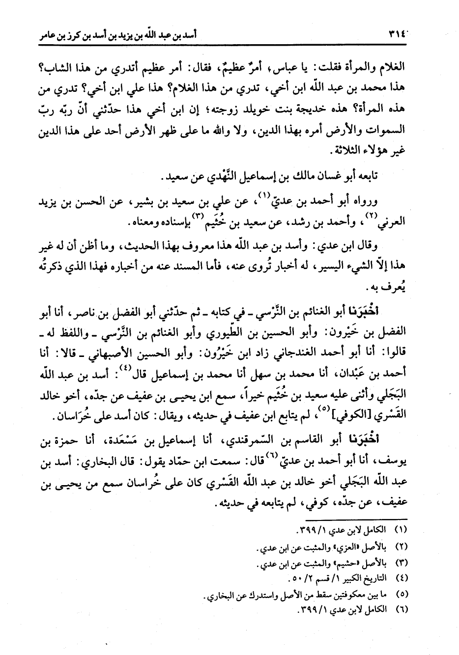 الغلام والمرأة فقلت يا عباس أمر عظيم فقال أمر عظيم أتدري من هذا الشاب هذا محمد بن عبد الله ابن أخي تدري من هذا الغلام هذا علي ابن أخي تدري من هذه المرأة هذه خديجة بنت خويلد زوجته إن ابن أخي هذا حدثني أن ربه رب السموات والأرض أمره بهذا الدين ولا والله ما على ظهر الأرض أحد على هذا الدين غير هؤلاء الثلاثة تابعه أبو غسان مالك بن إسماعيل النهدي عن سعيد ورواه أبو أحمد بن عدي (1) عن علي بن سعيد بن بشير عن الحسن بن يزيد العرني (2) وأحمد بن رشد عن سعيد بن خثيم (3) بإسناده ومعناه وقال ابن عدي وأسد بن عبد الله هذا معروف بهذا الحديث وما أظن أن له غير هذا إلا الشئ اليسير له أخبار تروى عنه فأما المسند عنه من أخباره فهذا الذي ذكرته يعرف به أخبرنا أبو الغنائم بن النرسي في كتابه ثم حدثني أبو الفضل بن ناصر أنا أبو الفضل بن خيرون وأبو الحسين بن الطيوري وأبو الغنائم بن النرسي واللفظ له قالوا أنا أبو أحمد الغندجاني زاد ابن خيرون وأبو الحسين الأصبهاني قالا أنا أحمد بن عبدان أنا محمد بن سهل أنا محمد بن إسماعيل قال أسد بن عبد الله البجلي وأثنى عليه سعيد بن خثيم خيرا سمع ابن يحيى بن عفيف عن جده أخو خالد القسري الكوفي (5) لم يتابع ابن عفيففي حديثه ويقال كان أسد على خراسان أخبرنا أبو القاسم بن السمرقندي أنا إسماعيل بن مسعدة أنا حمزة بن يوسف أنا أبو أحمد بن عدي (6) قال سمعت ابن حماد يقول قال البخاري أسد بن عبد الله البجلي أخو خالد بن عبد الله القسري كان على خراسان سمع من يحيى بن عفيف عن جده كوفي لم يتابعه في حديثه
