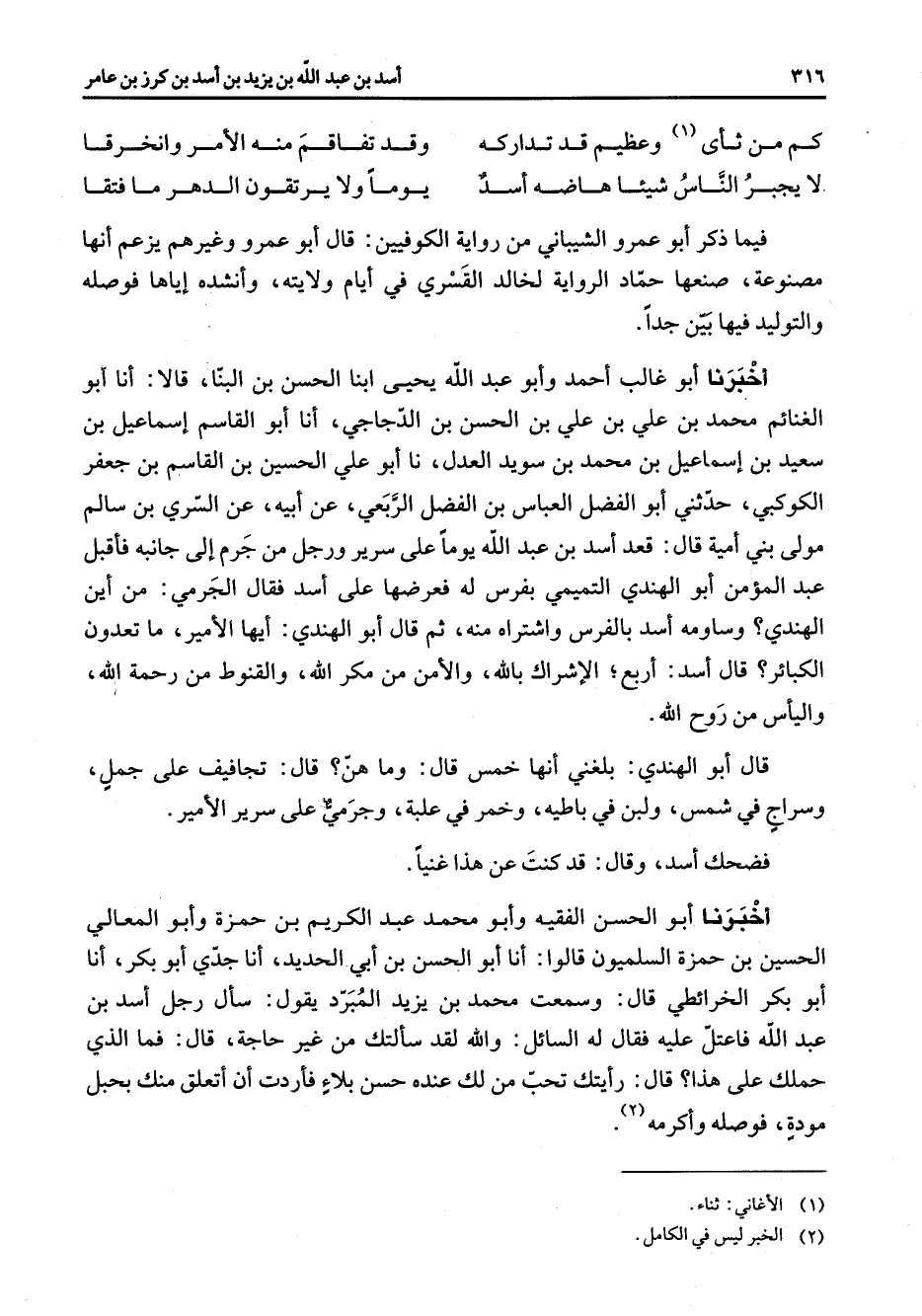 كم من ثأى (1) وعظيم قد تداركه * وقد تفاقم منه الأمر وانخرقا لا يجبر الناس شيئا هاضه أسد * يوما ولا يرتقون الدهر ما فتقا * فيما ذكر أبو عمرو الشيباني من رواية الكوفيين قال أبو عمرو وغيرهم يزعم أنها مصنوعة صنعها حماد الرواية لخالد القسري في أيام ولايته وأنشده إياها فوصله والتوليد فيها بين جدا أخبرنا أبو غالب أحمد وأبو عبد الله يحيى ابنا الحسن بن البنا قالا أنا أبو الغنائم محمد بن علي بن علي بن الحسن بن الدجاجي أنا أبو القاسم إسماعيل بن سعيد بن إسماعيل بن محمد بن سويد العدل نا أبو علي الحسين بن القاسم بن جعفر الكوكبي حدثني أبو الفضل العباس بن الفضل الربعي عن أبيه عن السري بن سالم مولى بني أمية قال قعد أسد بن عبد الله يوما على سرير ورجل من جرم إلى جانبه فأقبل عبد المؤمن أبو الهندي التميمي بفرس له فعرضها على أسد فقال الجرمي من أين الهندي وساومه أسد بالفرس واشتراه منه ثم قال أبو الهندي أيها الأمير ما تعدون الكبائر قال أسد أربع الإشراك بالله والأمن من مكر الله والقنوط من رحمة الله واليأس من روح الله قال أبو الهندي بلغني أنها خمس قال وما هن قال تجافيف على جمل وسراج في شمس ولبن في باطيه وخمر في علبة وجرمي على سرير الأمير فضحك أسد وقال قد كنت عن هذا غنيا أخبرنا أبو الحسن الفقيه وأبو محمد عبد الكريم بن حمزة وأبو المعالي الحسين بن حمزة السلميون قالوا أنا أبو الحسن بن أبي الحديد أنا جدي أبو بكر أنا أبو بكر الخرائطي قال وسمعت محمد بن يزيد المبرد يقول سأل رجل أسد بن عبد الله فاعتل عليه فقال له السائل والله لقد سألتك من غير حاجة قال فما الذي حملك على هذا قال رأيتك تحب من لك عنده حسن بلاء فأردت أن أتعلق منك بحبل مودة فوصله وأكرمه (2)