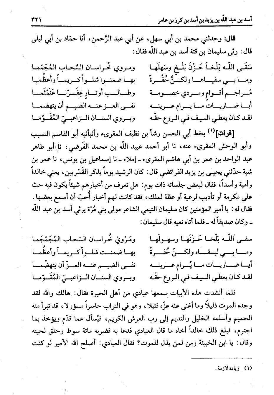 قال وحدثني محمد بن أبي سهل عن أبي عبد الرحمن أنا حماد بن أبي ليلى قال رثى سليمان بن قتة أسد بن عبد الله فقال * سقى الله بلخا حزن بلخ وسهلها * ومروي خراسان السحاب المجمما وما بي سقياها ولكن حفرة * بها ضمنوا شلوا كريما وأعظما مراجم أقوام ومردي خصومة * وطالب أوتار عفرنا عثمثما أبا ضاريات ما يرام عرينه * نفى العز عنه الضيم أن يتهضما لقد كان يعطي السيف في الروع حقه * ويروي السنان الزاعبي المقوما * قرأت (1) بخط أبي الحسن رشأ بن نظيف المقرئ وأنبأنيه أبو القاسم النسيب وأبو الوحش المقرئ عننا أبو أحمد عبيد الله بن محمد الفرضي نا أبو طاهر عبد الواحد بن عمر بن أبي هاشم المقرئ إملاء نا إسماعيل بن يونس نا عمر بن شبة حدثني يحيى بن يزيد الفرائضي قال كان الرشيد يوما يذكر القسريين يعني خالدا وأمية وأسدا فقال لبعض جلسائه ذات يوم هل تعرف من أخبارهم شيئا يكون فيه حث على مكرمة أو تأديب لرعية أو عظة لملك فقد كانت لهم أخبار أحب أن أسمع بعضها فقال له يا أمير المؤمنين كان سليمان التيمي الشاعر مولى بني مرة يرثي أسد بن عبد الله وكان صديقا له فلما أتاه نعيه قال سليمان * سقى الله بلخا حزنها وسهولها * ومروي خراسان السحاب المجمجما وما بي ليسقاه ولكن حفرة * بها ضمنت شلوا كريما وأعظما أيا ضاريات ما يرام عرينه * نفى الضيم عنه العز أن يتهضما لقد كان يعطي السيف في الروع حقه * ويروي السنان الزاعبي المقوما * فلما أنشدت هذه الأبيات سمعها عبادي من أهل الحيرة فقال هالك والله لقد وجده الموت ذليلا وما أغنى عنه عزه فتيلا وهو في التراب حاسرا مسؤولا قد تبرأ منه الحيمم وأسلمه الخليل والنديم إلى رب العرش الكريم فيسأل عما قدم ويؤخذ بما اجترم فبلغ ذلك خالدا أخاه ما قال العبادي فدعا به فضربه مائة سوط وحلق لحيته وقال يا ابن الخبيثة ومن لمن يذل للموت فقال العبادي أصلح الله الأمير لو كنت