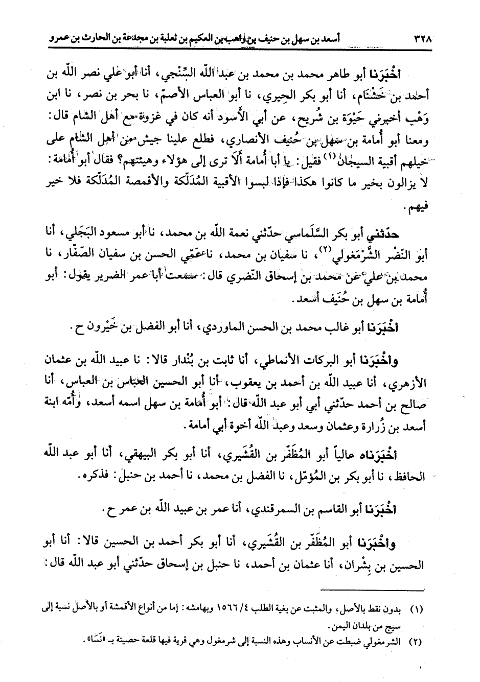 أخبرنا أبو طاهر محمد بن محمد بن عبد الله السنجي أنا أبو علي نصر الله بن أحمد بن خشنام أنا أبو بكر الحيري نا أبا العباس الأصم نا بحر بن نصر نا ابن وهب أخبرني حيوة بن شريح عن أبي الأسود أنه كان في غزوة مع أهل الشام ومعنا أبو أمامة بن سهل بن حنيف الأنصاري فطلع علينا جيش من أهل الشام على خيلهم أقبية السيجان (1) فقيل يا أبا أمامة ألا ترى إلى هؤلاء وهيئتهم فقال أبا أمامة لا يزالون بخير ما كانوا هكذا فإذا لبسوا الأقبية المدلكة والأقمصة المدلكة فلا خير فيهم حدثني أبو بكر السلماسي حدثني نعمة الله بن محمد نا أبو مسعود البجلي أنا أبو النضر الشر مغولي (2) نا سفيان بن محمد نا عمي الحسن بن سفيان الصفار نا محمد بن علي عن محمد بن إسحاق النضري قال سمعت أبا عمر الضرير يقول أبو أمامة بن سهل بن حنيف أسعد أخبرنا أبو غالب محمد بن الحسن الماوردي أنا أبو الفضل بن خيرون وأخبرنا أبو البركات الأنماطي أنا ثابت بن بندار قالا نا عبيد الله بن عثمان الأزهري أنا عبيد الله بن أحمد بن يعقوب أنا أبو الحسين العباس بن العباس أنا صالح بن أحمد حدثني أبي أبو عبد الله قال أبو أمامة بن سهل اسمه أسعد وأمه ابنة اسعد بن زرارة وعثمان وسعد وعبد الله أخوة أبي أمامة أخبرناه عاليا أبو المظفر بن القشيري أنا أبو بكر البيهقي أنا أبو عبد الله الحافظ نا أبو بكر بن المؤمل نا الفضل بن محمد نا أحمد بن حنبل فذكره أخبرنا أبو القاسم بن السمرقندي أنا عمر بن عبيد الله بن عمر وأخبرنا أبو المظفر بن القشيري أنا أبو بكر أحمد بن الحسين قالا أنا أبو الحسين بن بشران أنا عثمان بن أحمد نا حنبل بن إسحاق حدثني أبو عبد الله قال