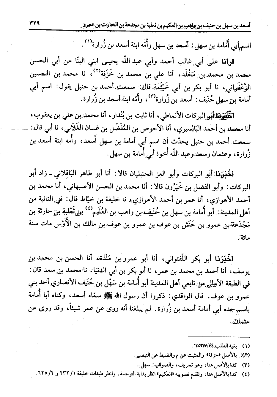 اسم أبي أمامة بن سهل أسعد بن سهل وأمه ابنة أسعد بن زرارة (1) قرأنا على أبي غالب أحمد وأبي عبد الله يحيى ابني البنا عن أبي الحسن محمد بن محمد بن مخلد أنا علي بن محمد بن خزفة نا محمد بن الحسين الزعفراني نا أبو بكر بن أبي خيثمة قال سمعت أحمد بن حنبل يقول اسم أبي أمامة بن سهل حنيف أسعد بزرارة (3) وأمه ابنة أسعد بن زرارة أخبرنا أبو بكر الأنماطي أنا ثابت بن بندار أنا محمد بن علي بن يعقوب أنا محمد بن أحمد البابسيري أنا الأحوص بن المفضل بن غسان الغلابي نا أبي قال سمعت أحمد بن حنبل يحدث أن اسم أبي أمامة بن سهل أسعد وأمه ابنة أسعد بن زرارة وعثمان وسعد وعبد الله أخوة أبي أمامة بن سهل أخبرنا أبو البركات وأبو العز الحنبليان قالا أنا أبو طاهر الباقلاني زاد أبو البركات وأبو الفضل بن خيرون قالا أنا محمد بن الحسن الأصبهاني أنا محمد بن أحمد الأهوازي نا عمر بن أحمد الأهوازي نا خليفة بن خياط قال في الثانية من أهل المدينة أبو أمامة بن سهل بن حنيف بن واهب بن العليم (4) بن ثعلبة بن حارثة بن مجدعة بن عمرو بن حنش بن عوف بن عمرو بن عوف بن مالك بن الأوس مات سنة مائة أخبرنا أبو بكر اللفتواني أنا أبو عمرو بن مندة أنا الحسن بن محمد بن يوسف أنا أحمد بن محمد بن عمر نا أبو بكر بن أبي الدنيا نا محمد بن سعد قال في الطبقة الأولى من تابعي أهل المدينة أبو أمامة بن سهل بن حنيف الأنصاري أحد بنى عمرو بن عوف قال الواقدي ذكروا أن رسول الله (صلى الله عليه وسلم) سماه أسعد وكناه أبا أمامة باسم جده أبي أمامة أسعد بن زرارة لم يبلغنا أنه روى عن عمر شيئا وقد روى عن عثمان